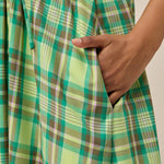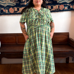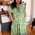 It is made out of a dead stock, cotton voile fabrication in a green, brown, yellow and pink woven plaid design.
