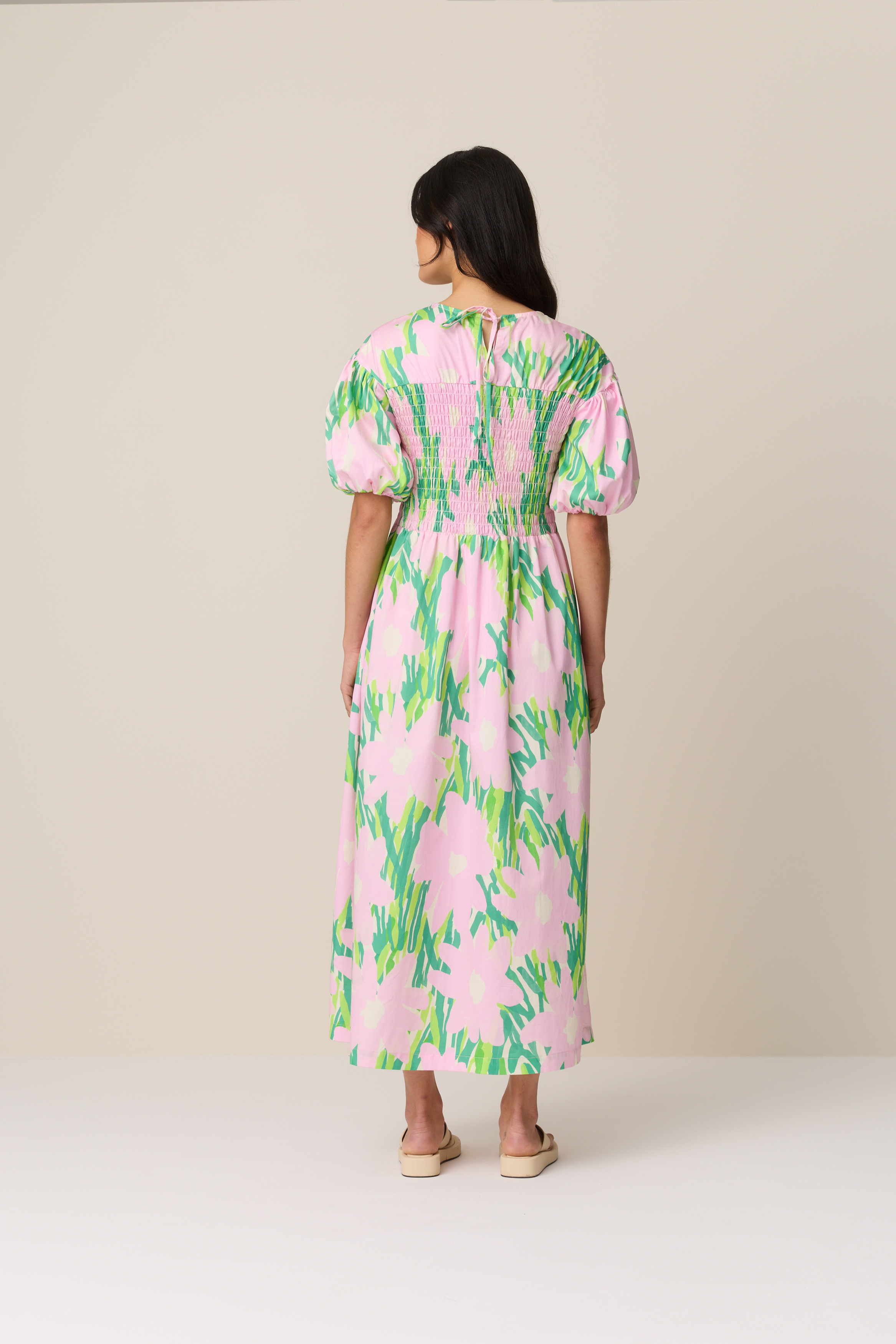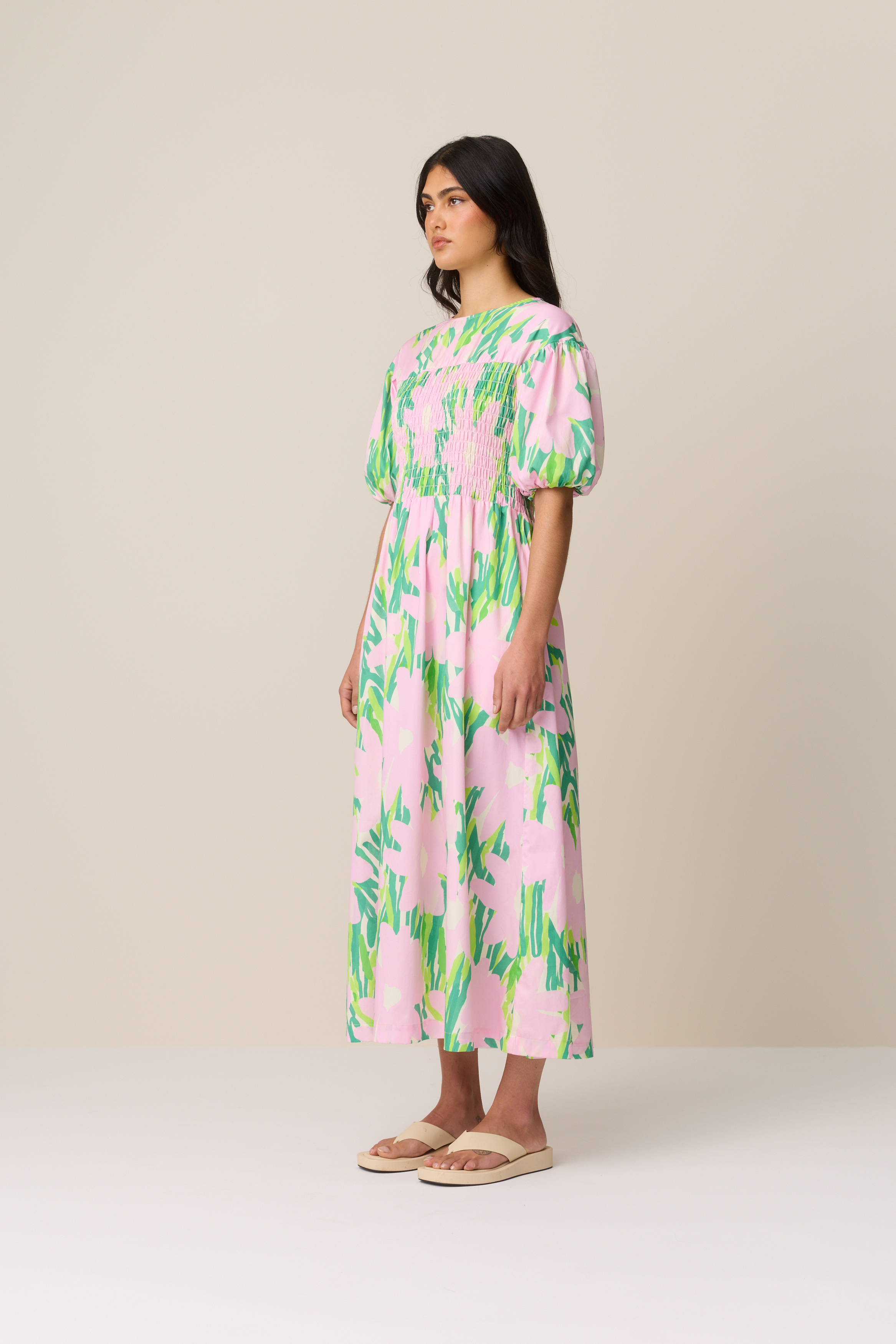 The Fable Dress is a shirred, puffed sleeved, midi dress dress.