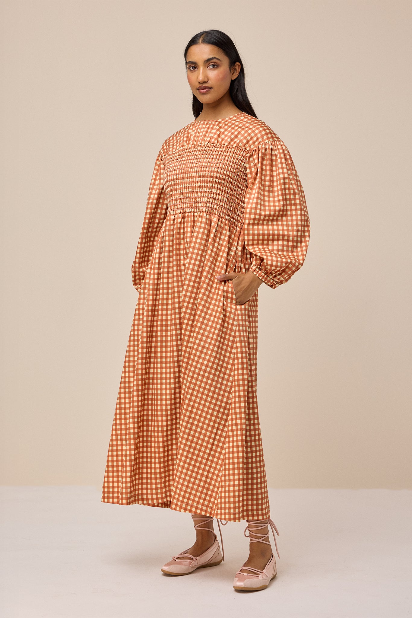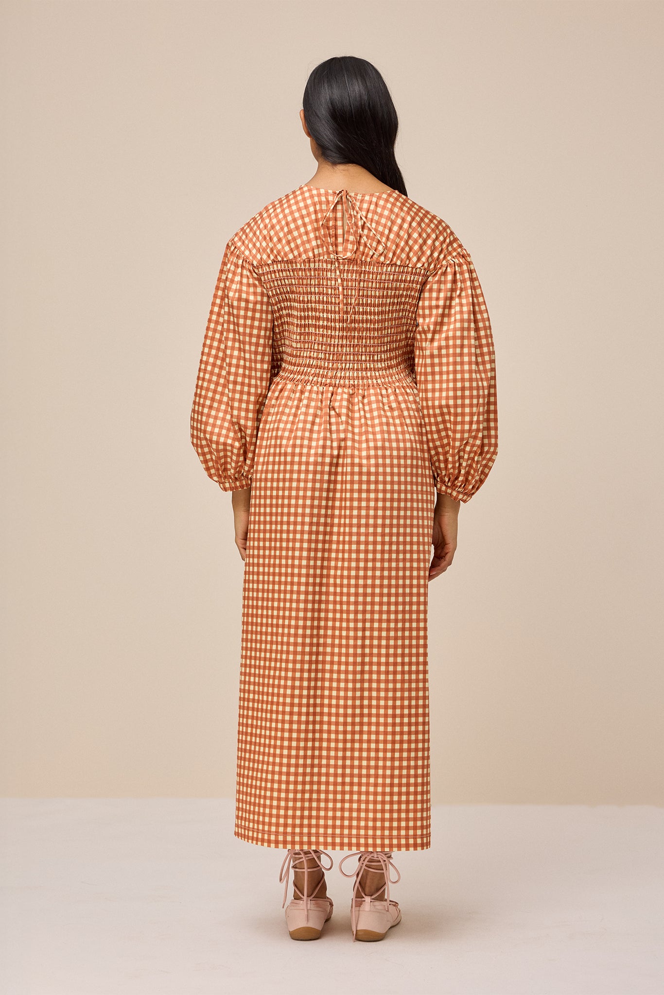 The Fable Dress is a shirred, puffed sleeved, midi dress dress.