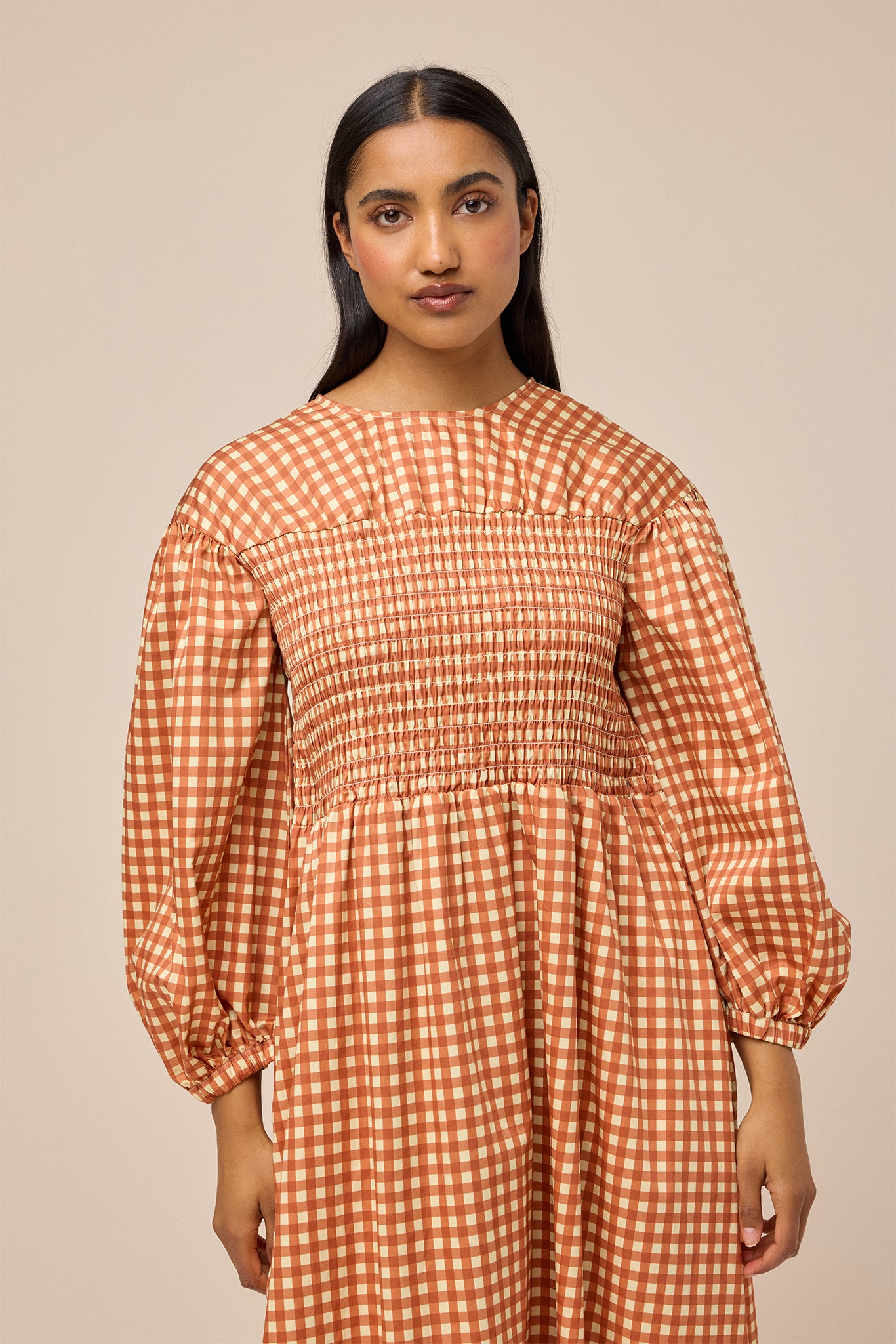 I really like the material (a deep rust and cream), the length, the flow and the smocking of this dress. My one tiny niggle, which will not interfere with me wearing and enjoying my new frock, is that the sleeves are just a tad too billowy.