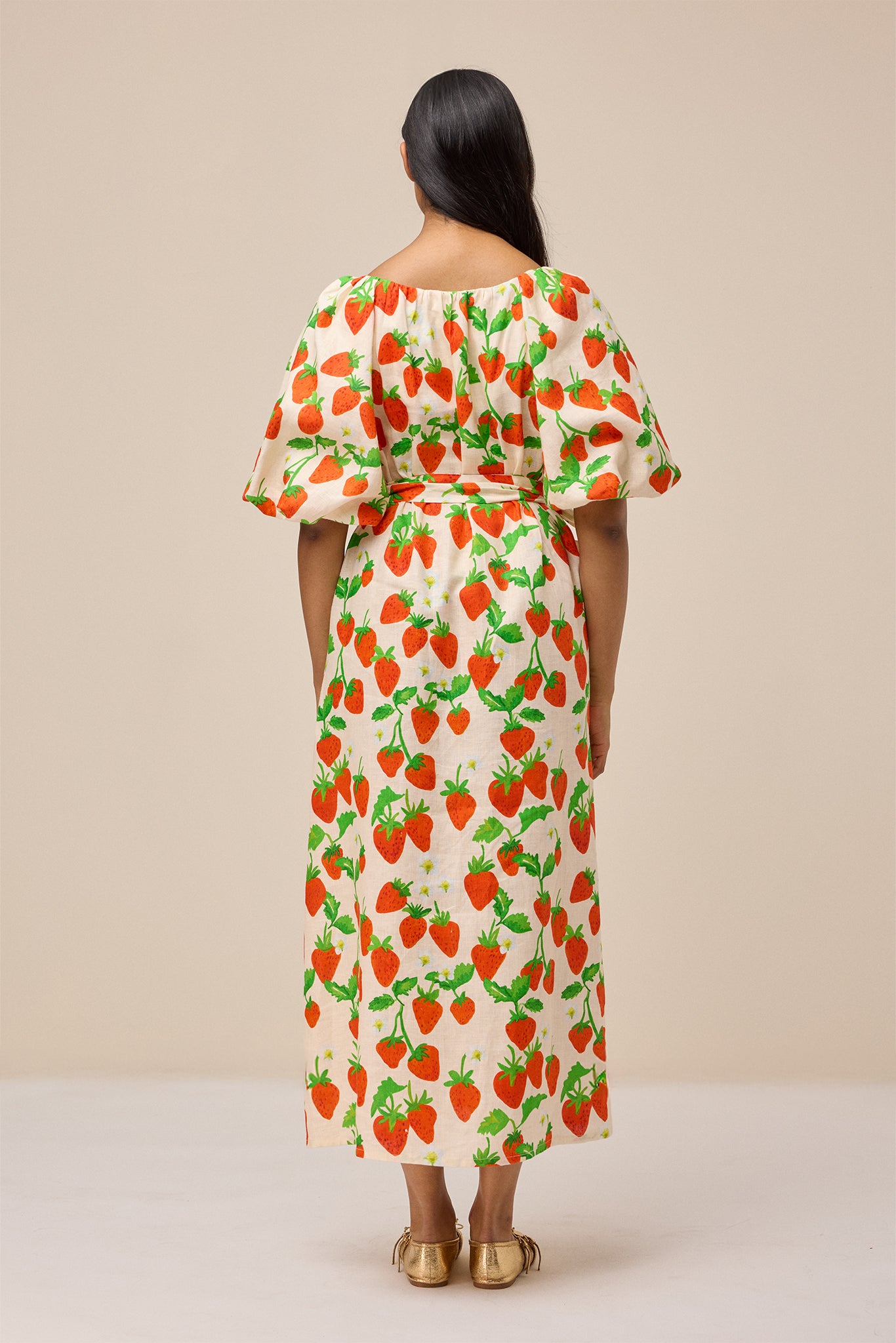 It is made out of 100% Linen and features our new Strawberry, Grasshopper print.