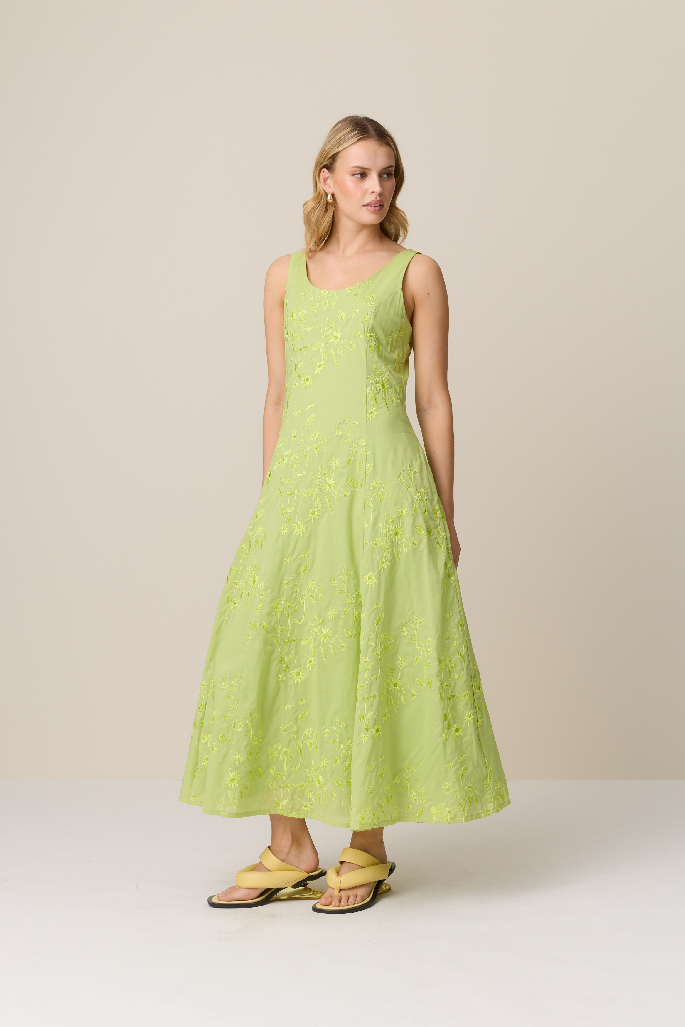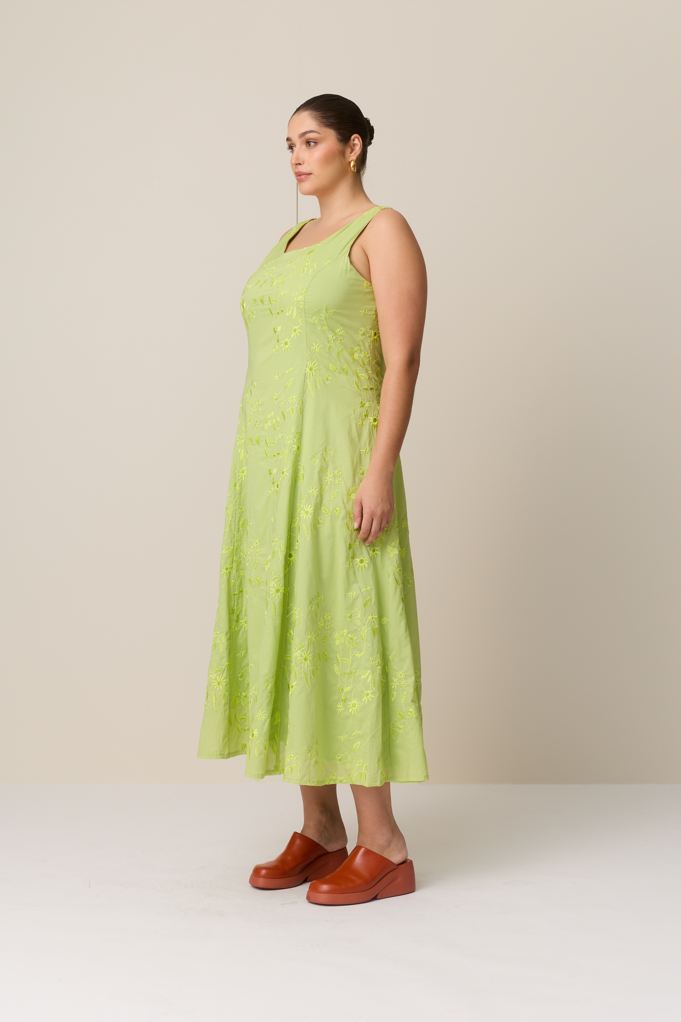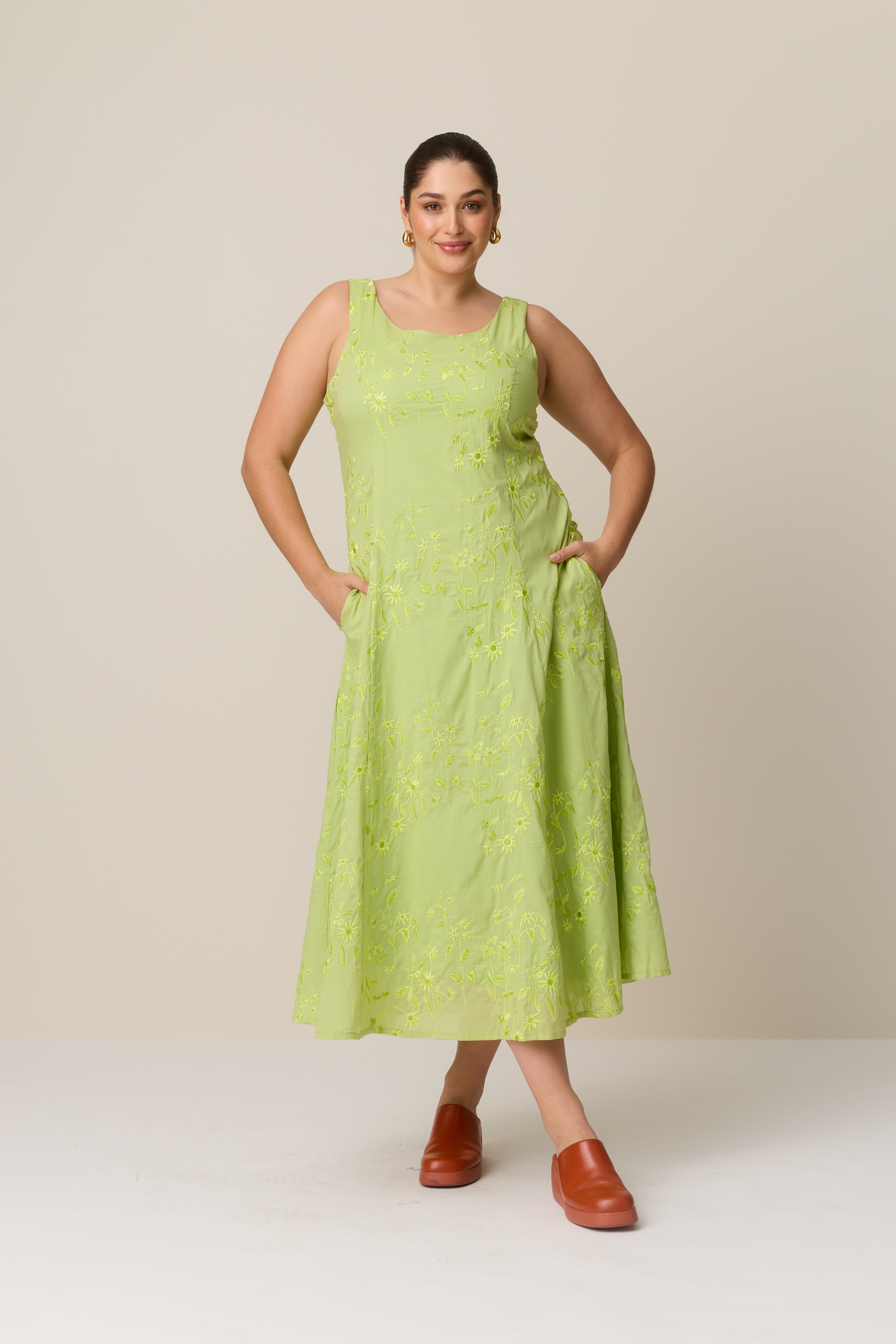 Our Trinket Dress is a semi-fitted princess seamed sun dress featuring our Matcha Garden embroidery.
