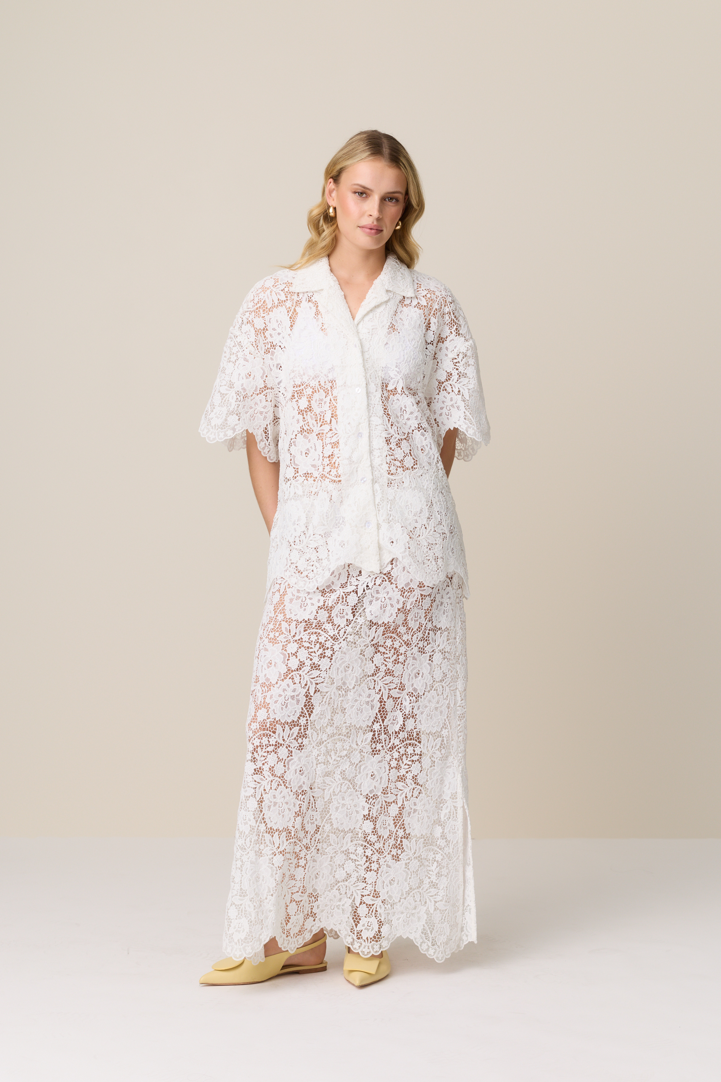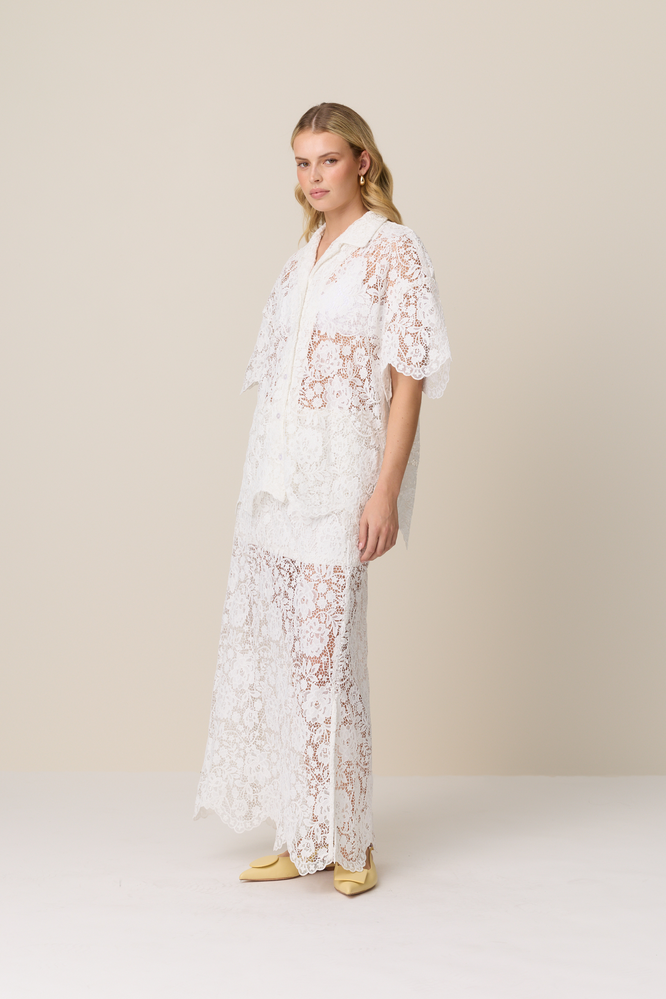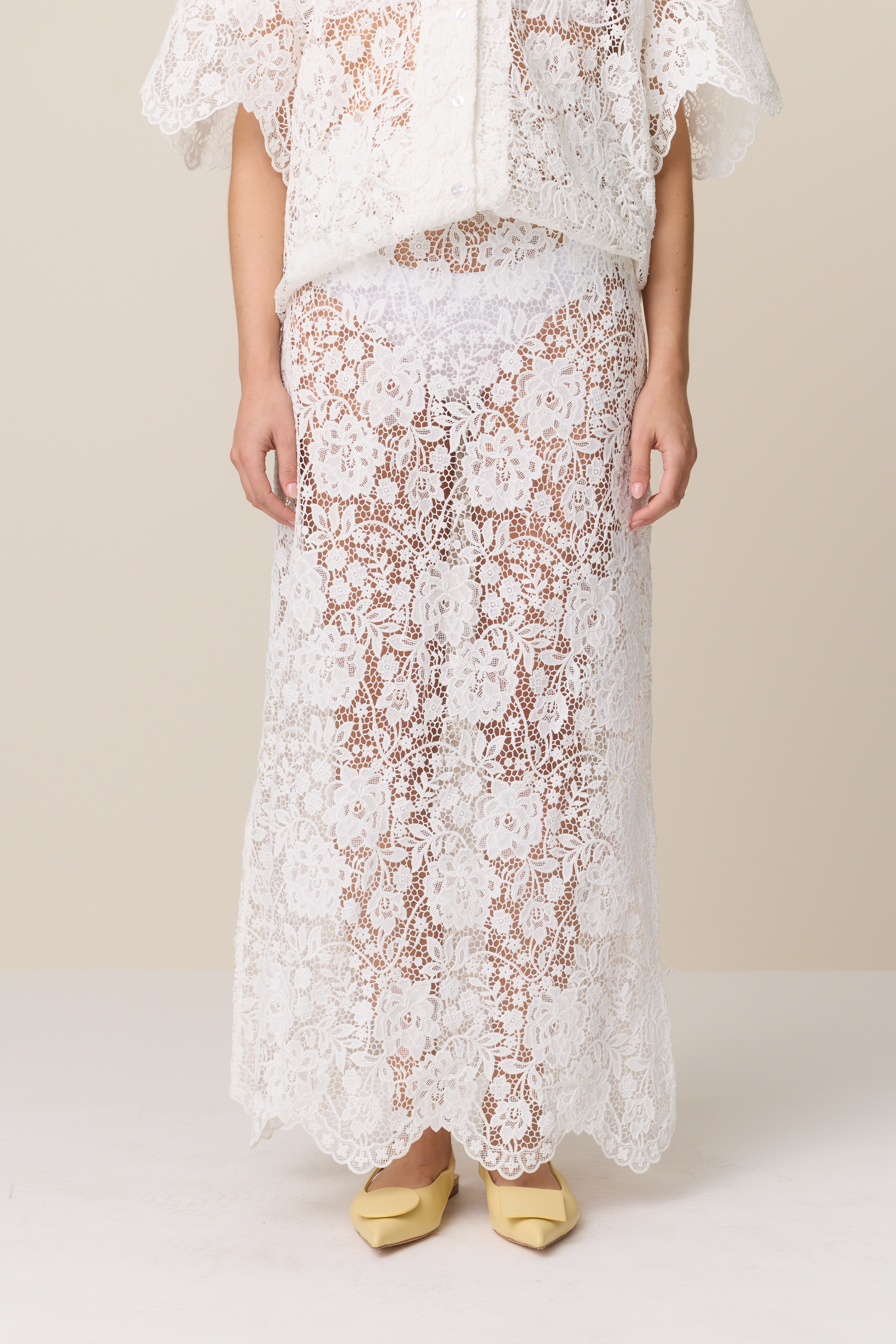 The Valletta Skirt is a maxi length, sheer lace skirt.