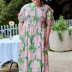 The Fable Dress is a shirred, puffed sleeved, midi dress dress.