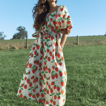 It is made out of 100% Linen and features our new Strawberry, Grasshopper print.