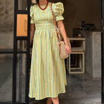 This Token Dress is made out of a cotton poplin fabrication printed in our Sunroom Stripe print. The fabric has a slight sateen finish.
