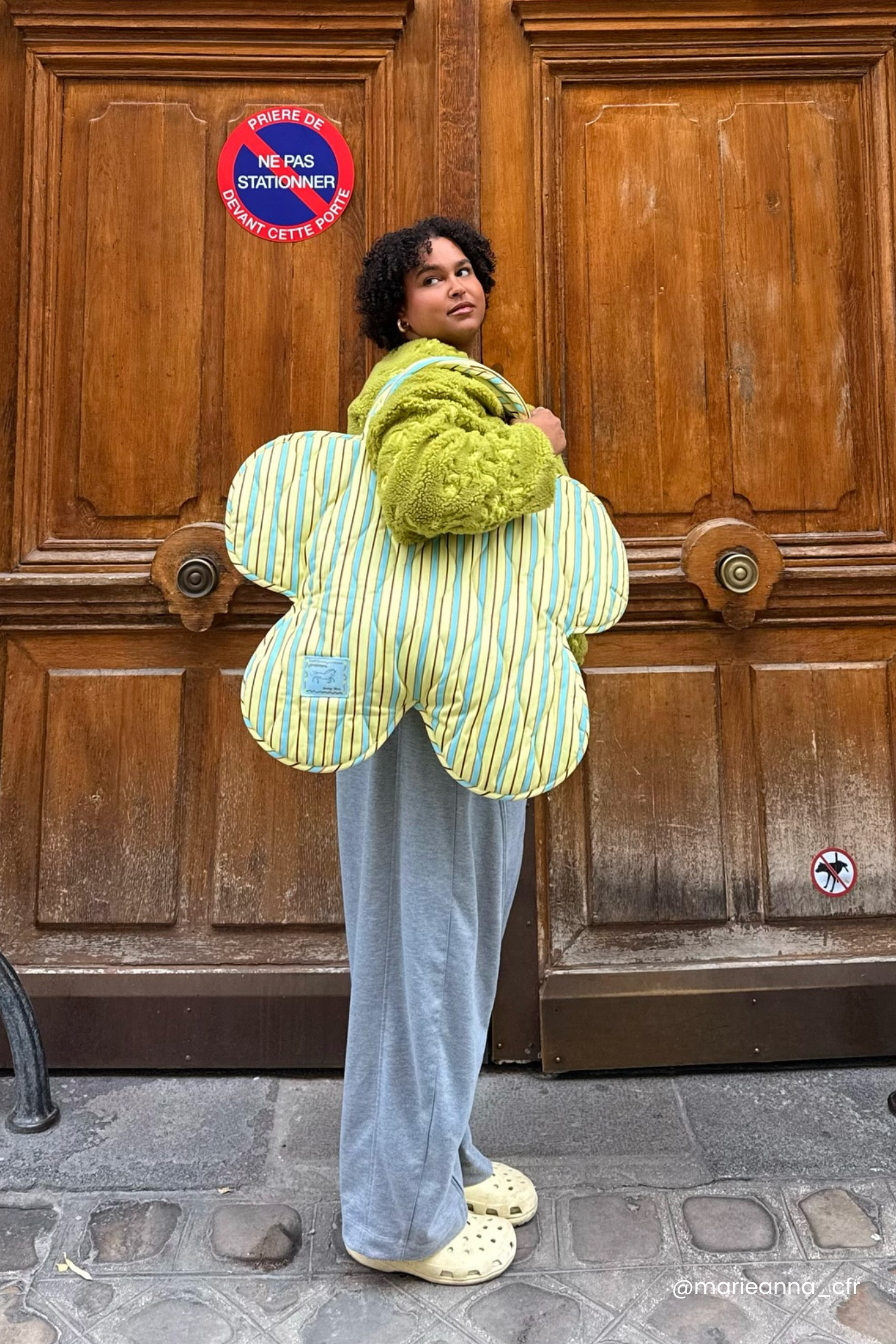 The bag is shaped to look like a flower when worn on the shoulder or held by the straps.