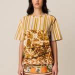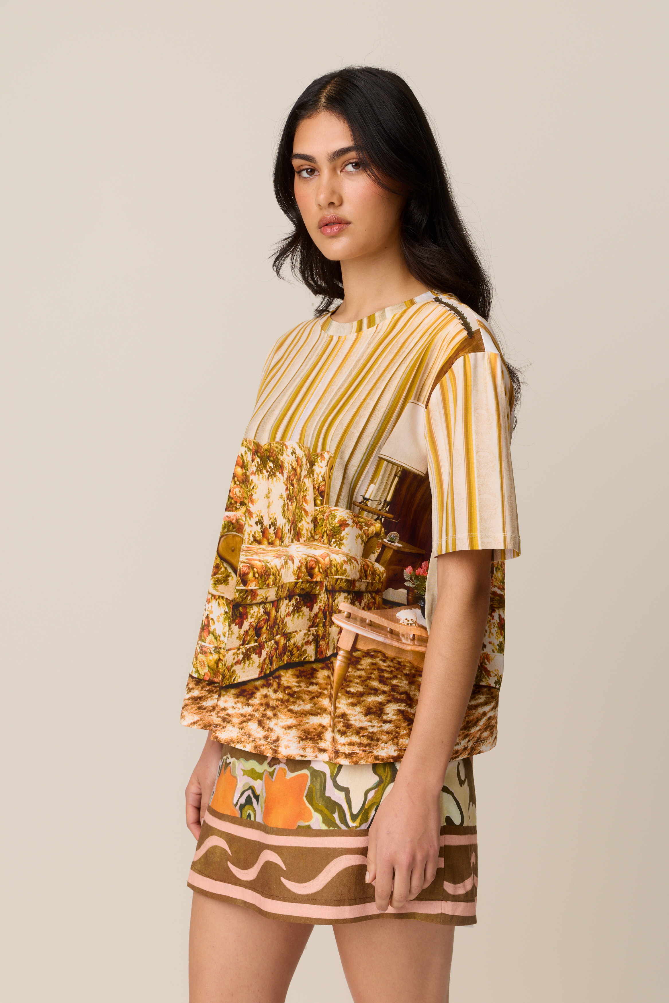It is made out of the same cotton jersey as our Dunes and Sunny dresses. It is the same cut as our 'Story' tees, just made out of a lighter jersey fabric better suited for all over printing.