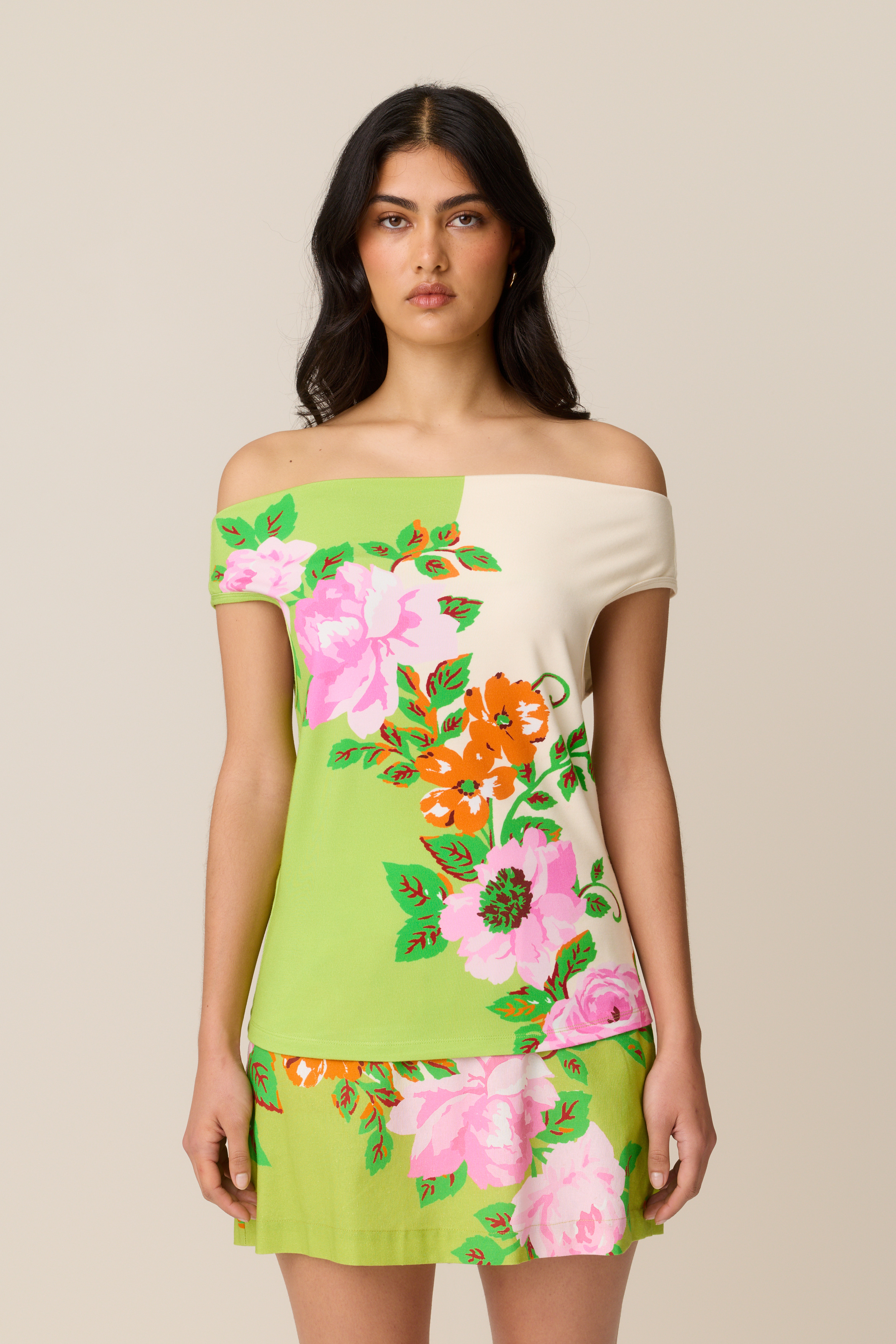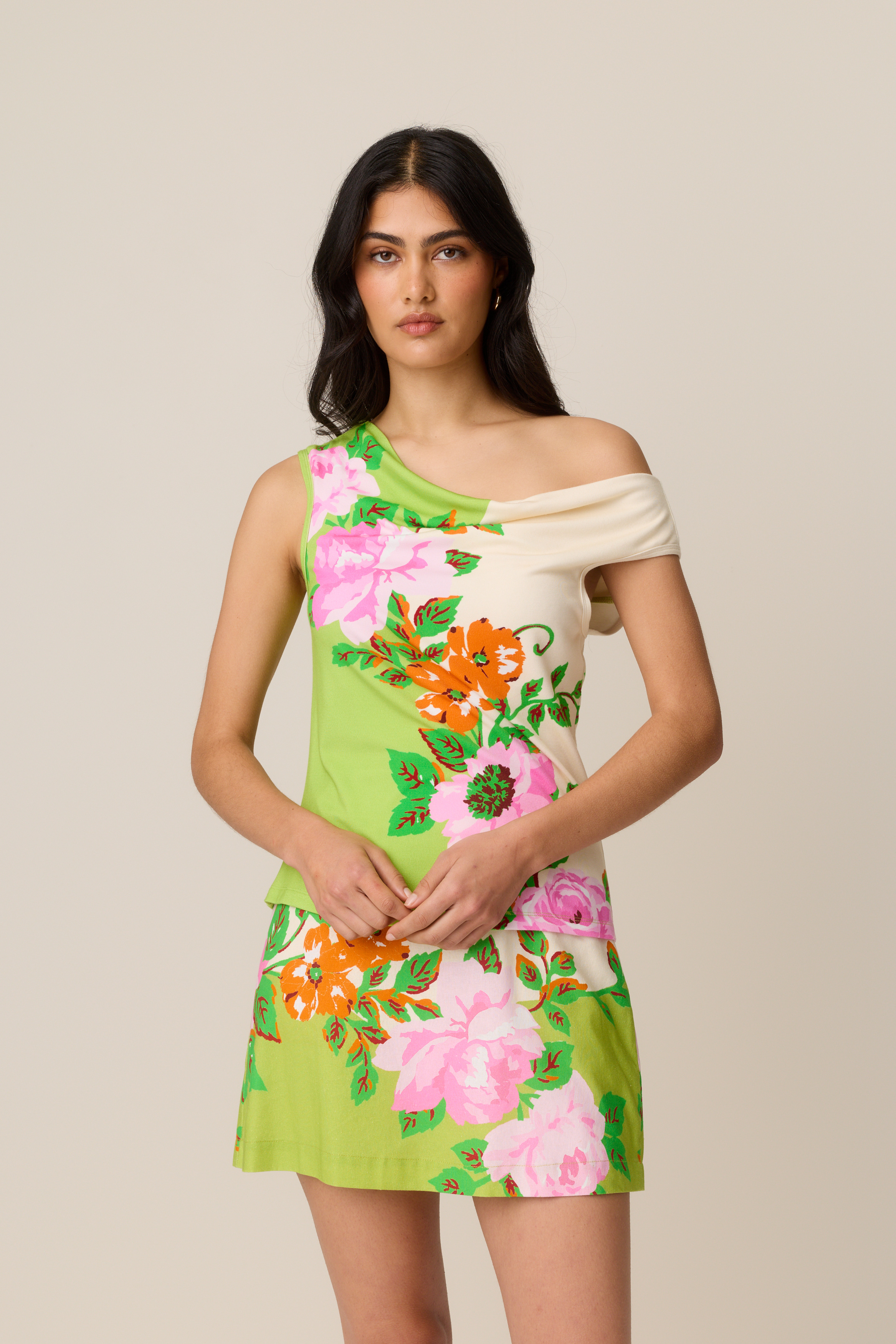 The silhouette is relaxed with a cowl neckline that can be styled on or off the shoulder, giving you effortless versatility.