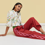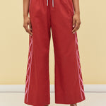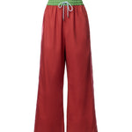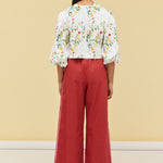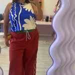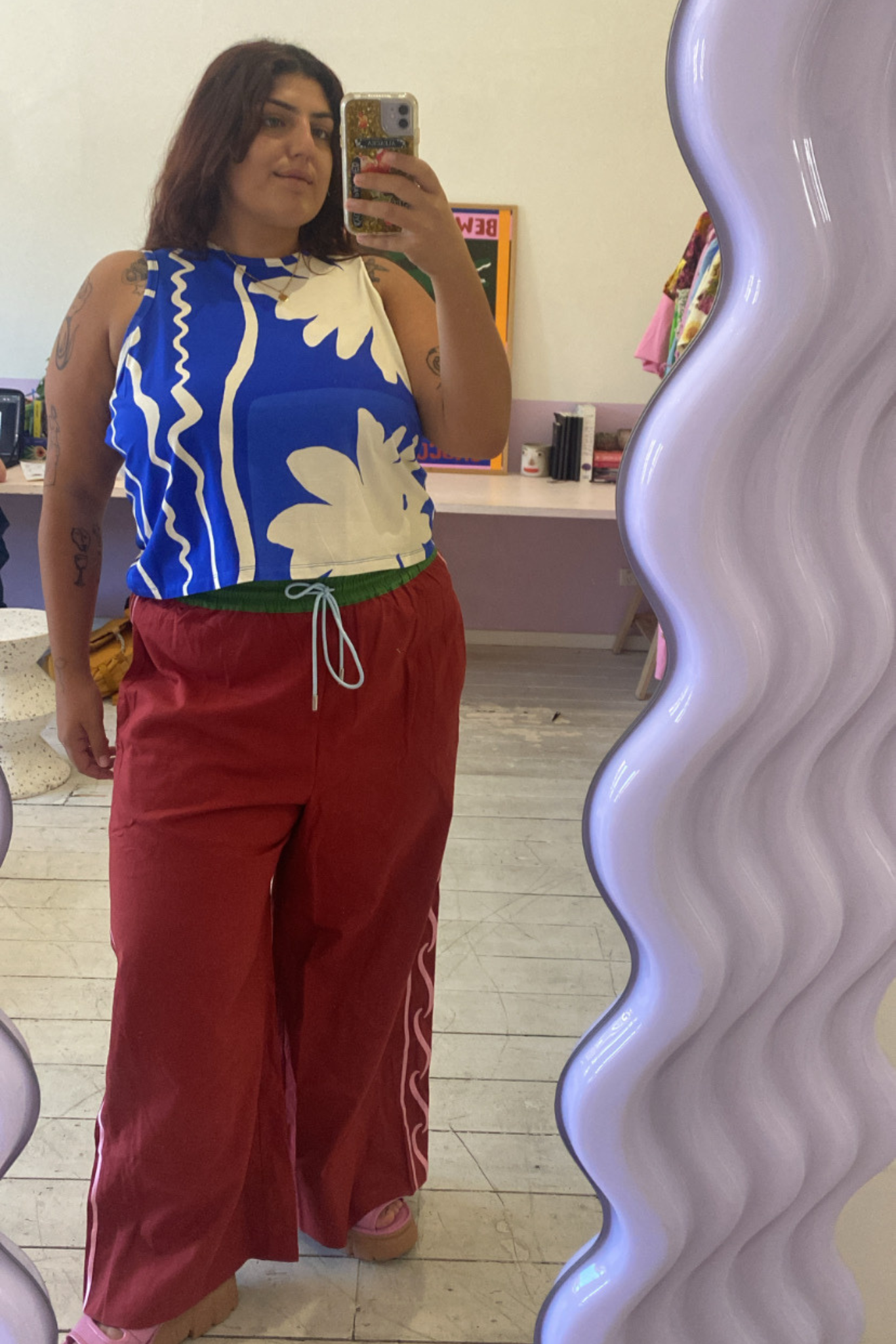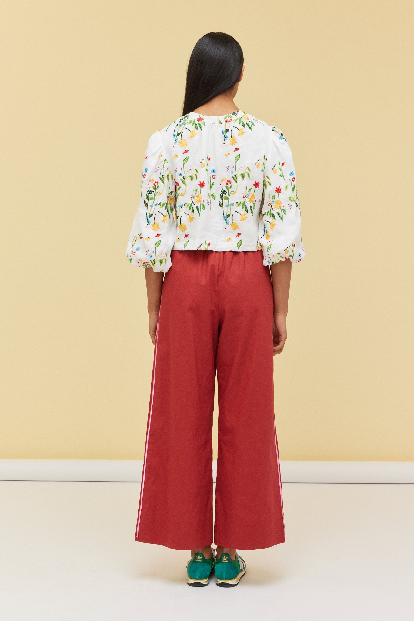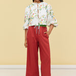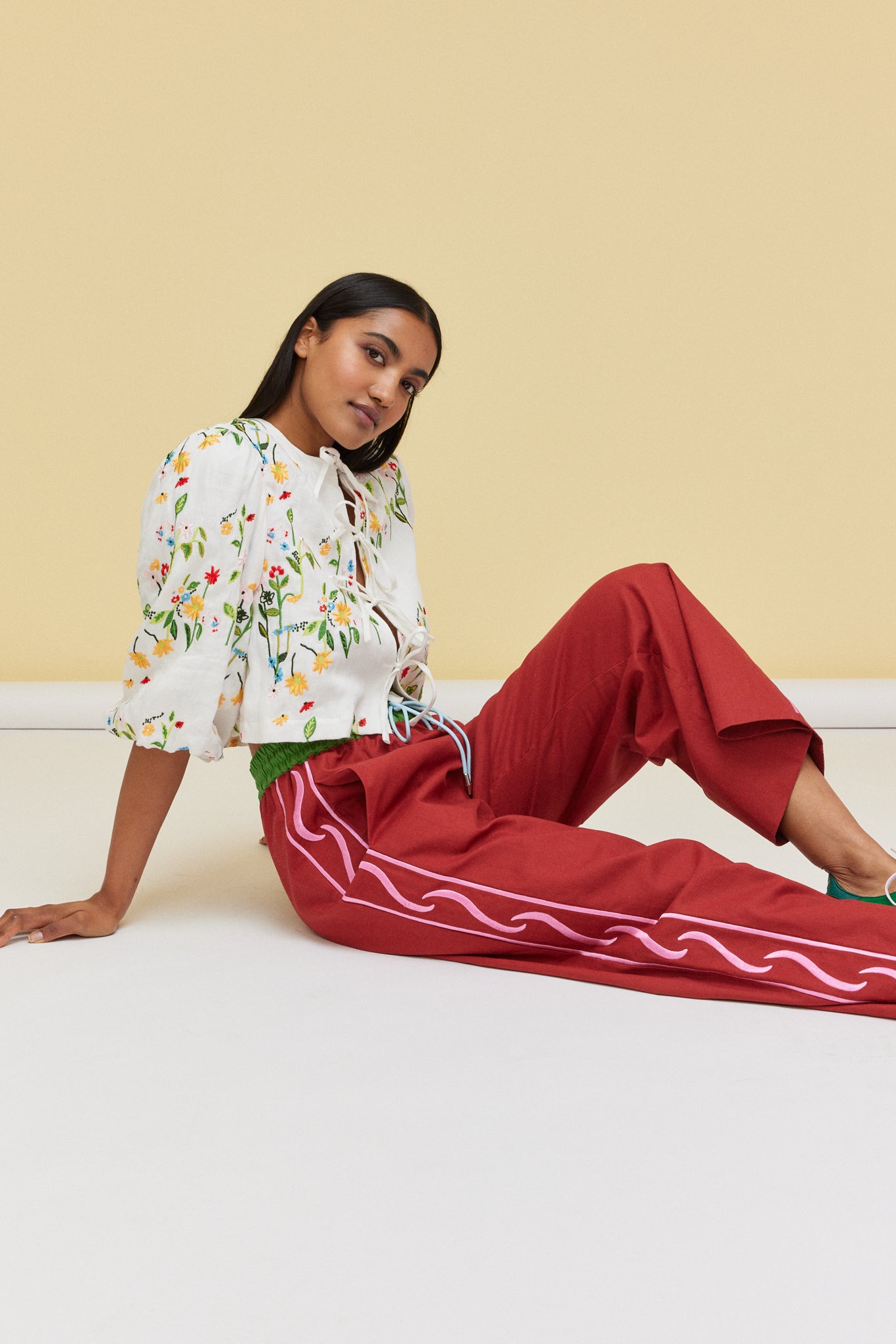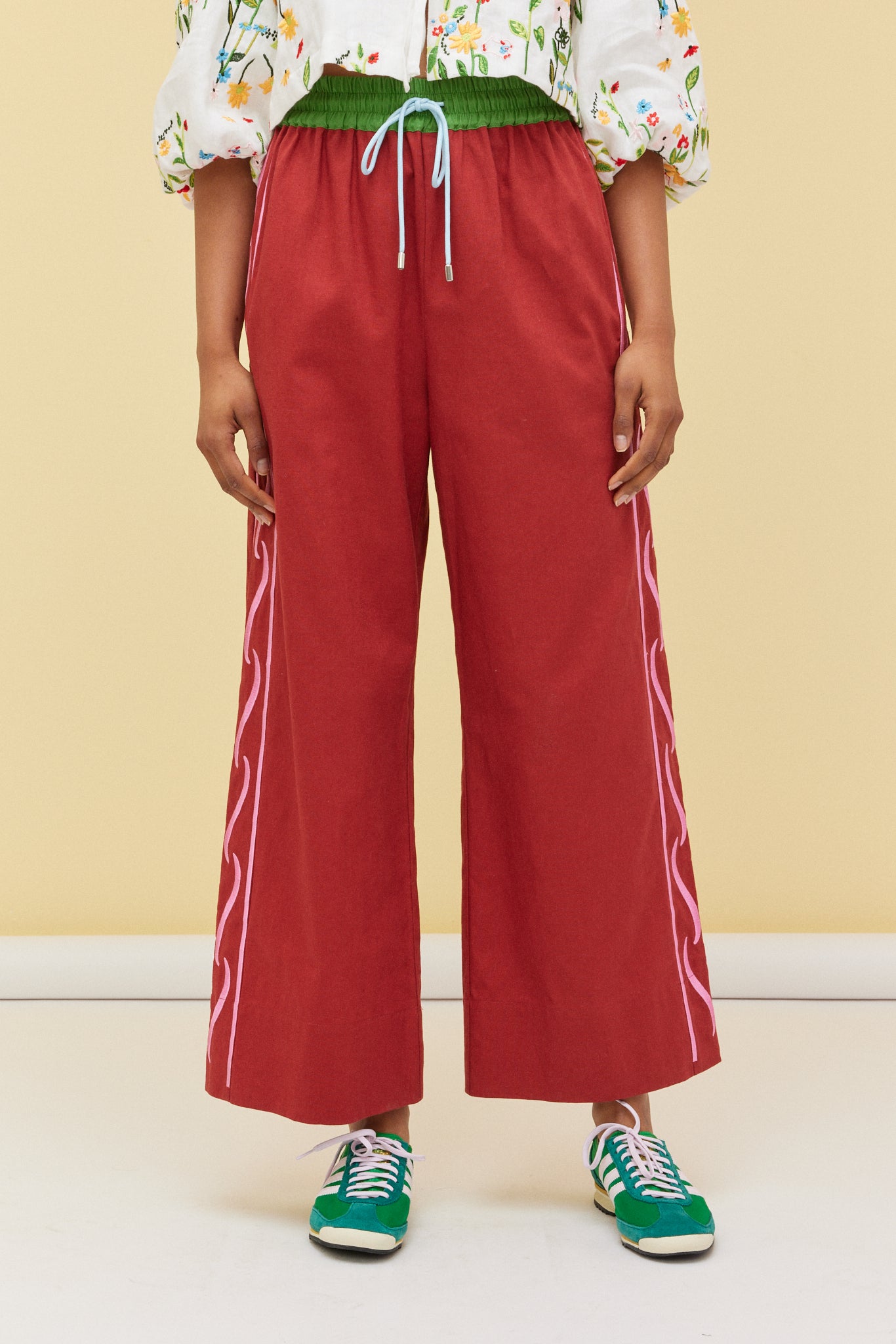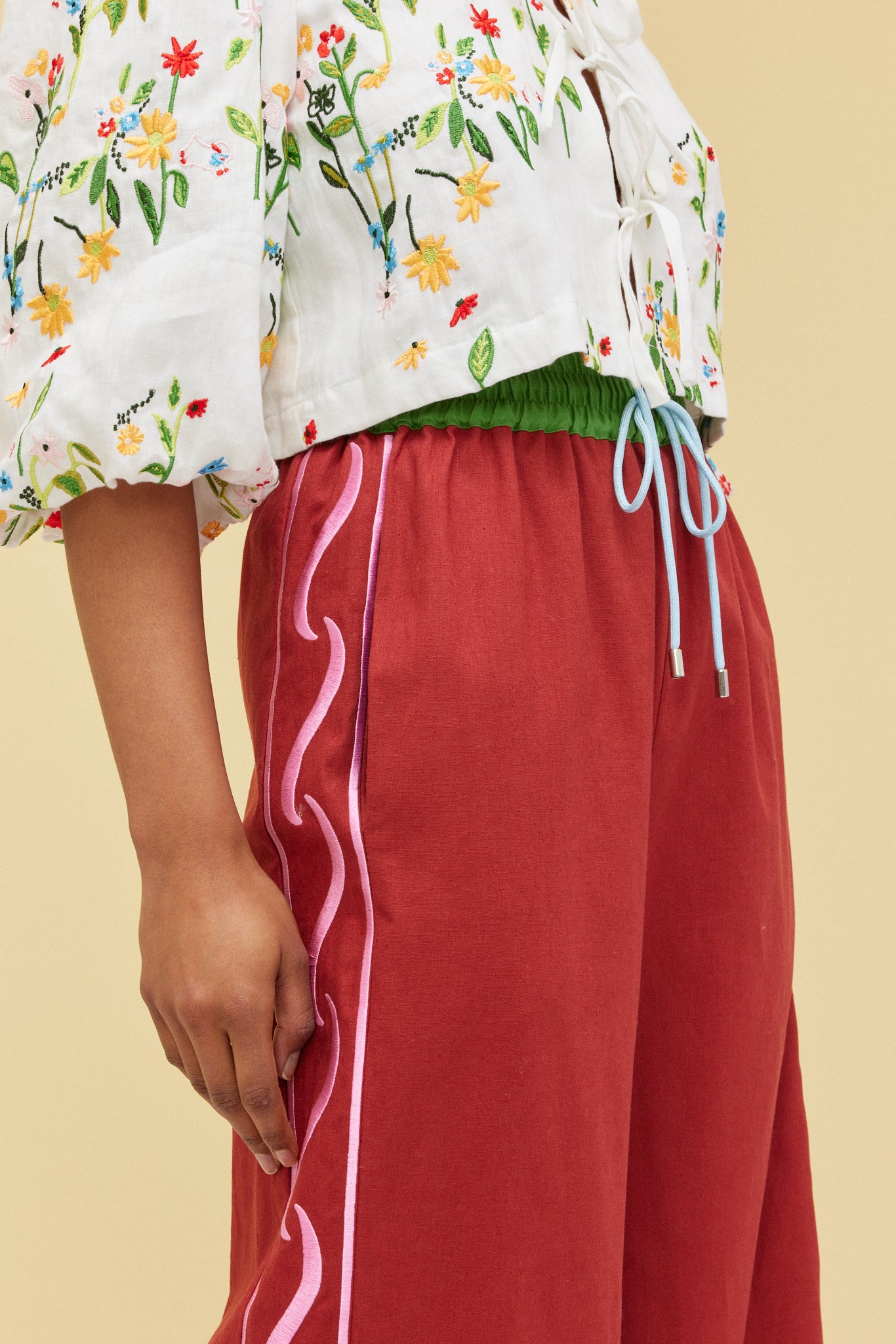 The Column pant is made out of a red, terracotta coloured Linen Cotton. We have chosen this fabric as it has great drape, is mid-weight for transeasonal wear and is durable. The waistband is in an emerald green colour and the embroidery on the side panels is pink.
