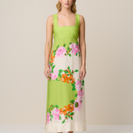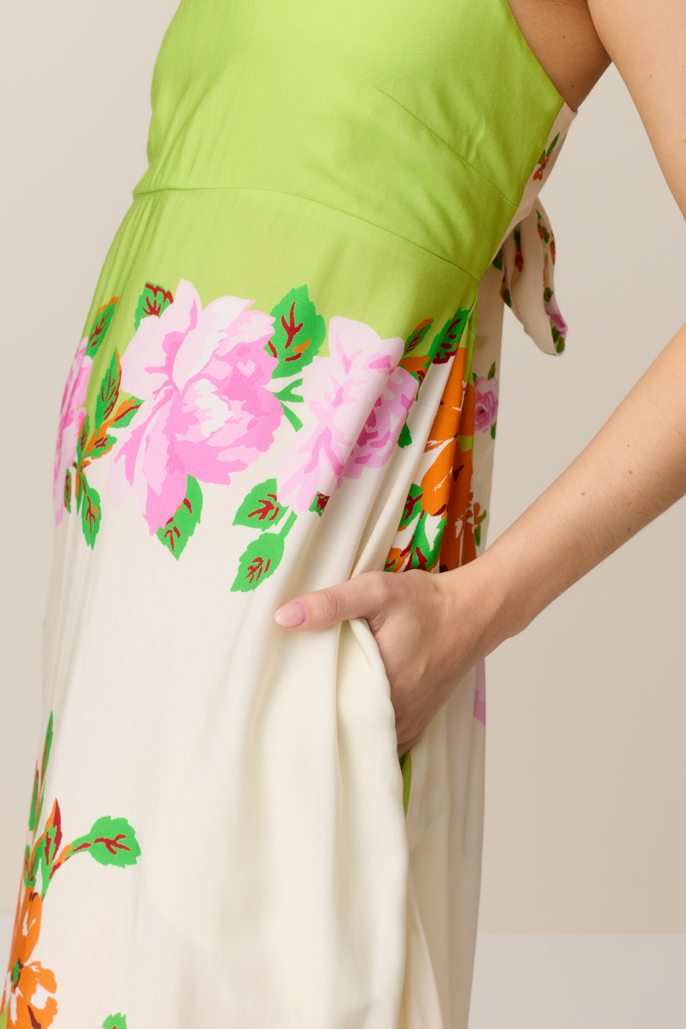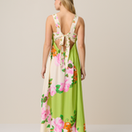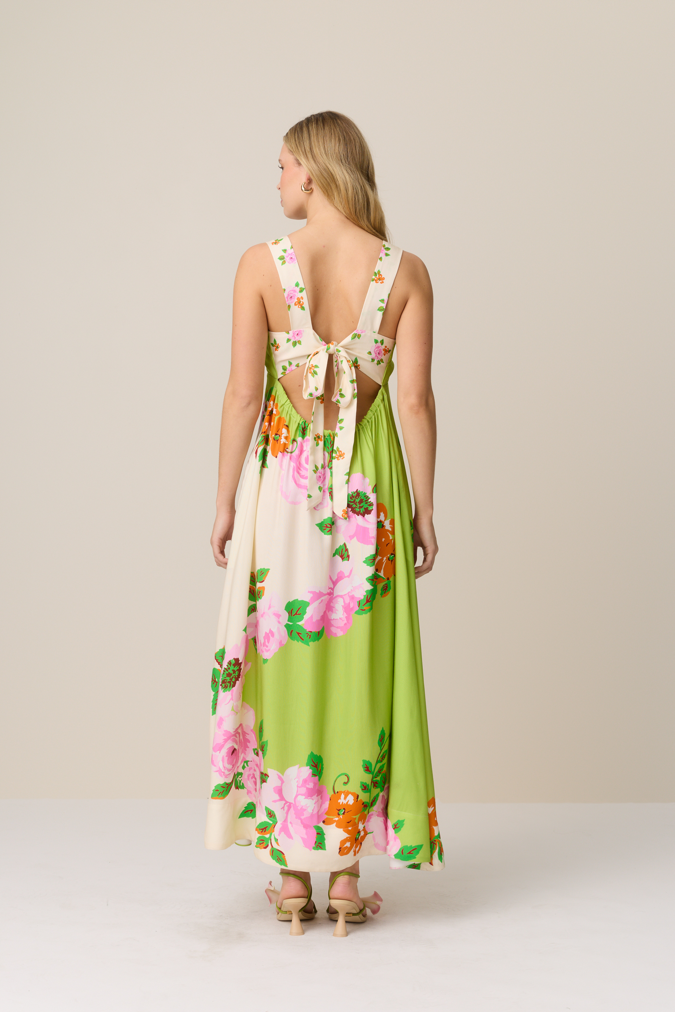 The silhouette features an empire waistline flowing into a relaxed a-line skirt with pockets. The open back is finished with elastic at the waist for comfort and a tie-back detail for an adjustable fit. The back tie is printed in a contrast, Roses design and the skirt is placement printed in our Tablecloth print.