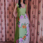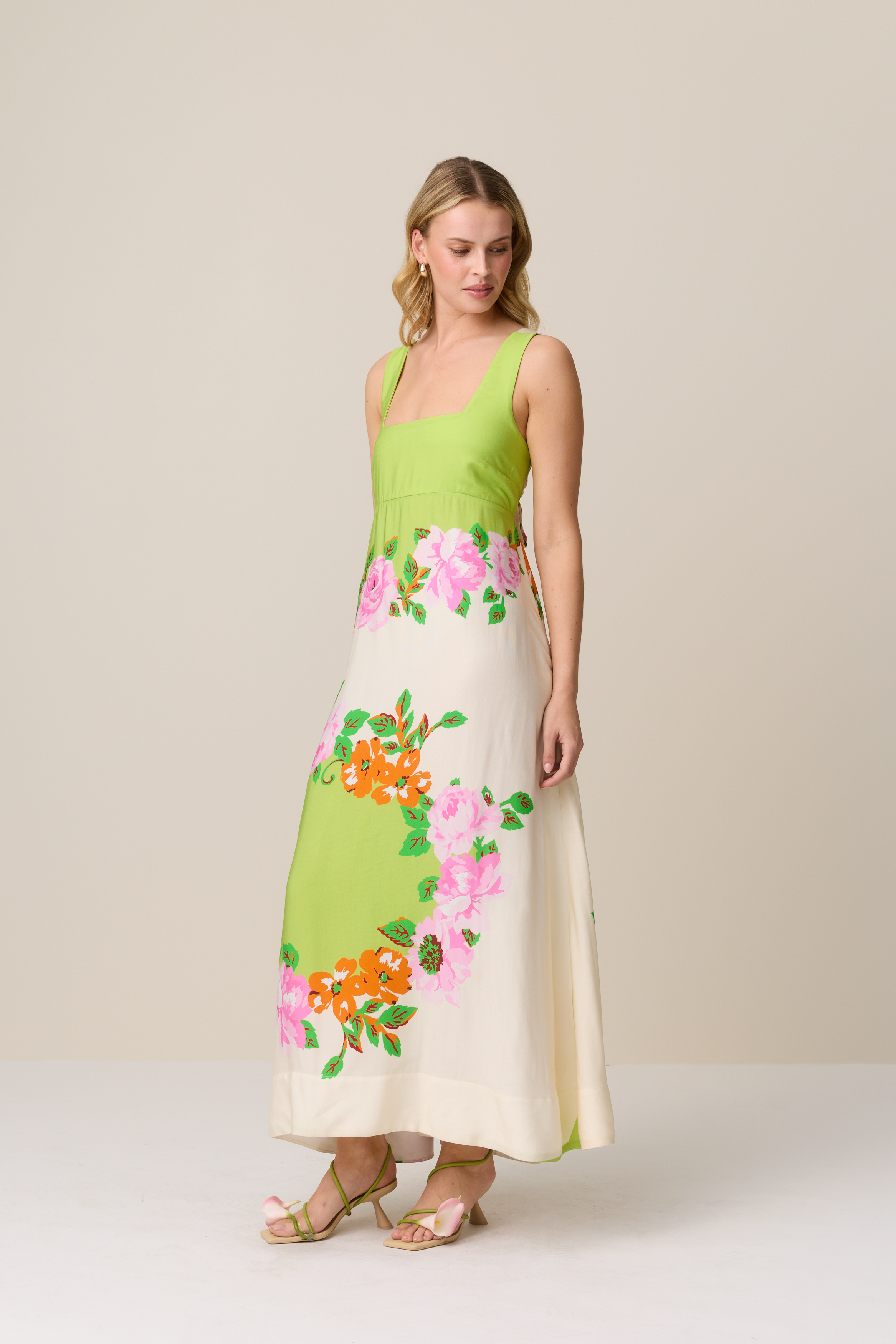 The Parlour Dress is a sleeveless, maxi-length shape with a deep square neckline and thick shoulder straps.