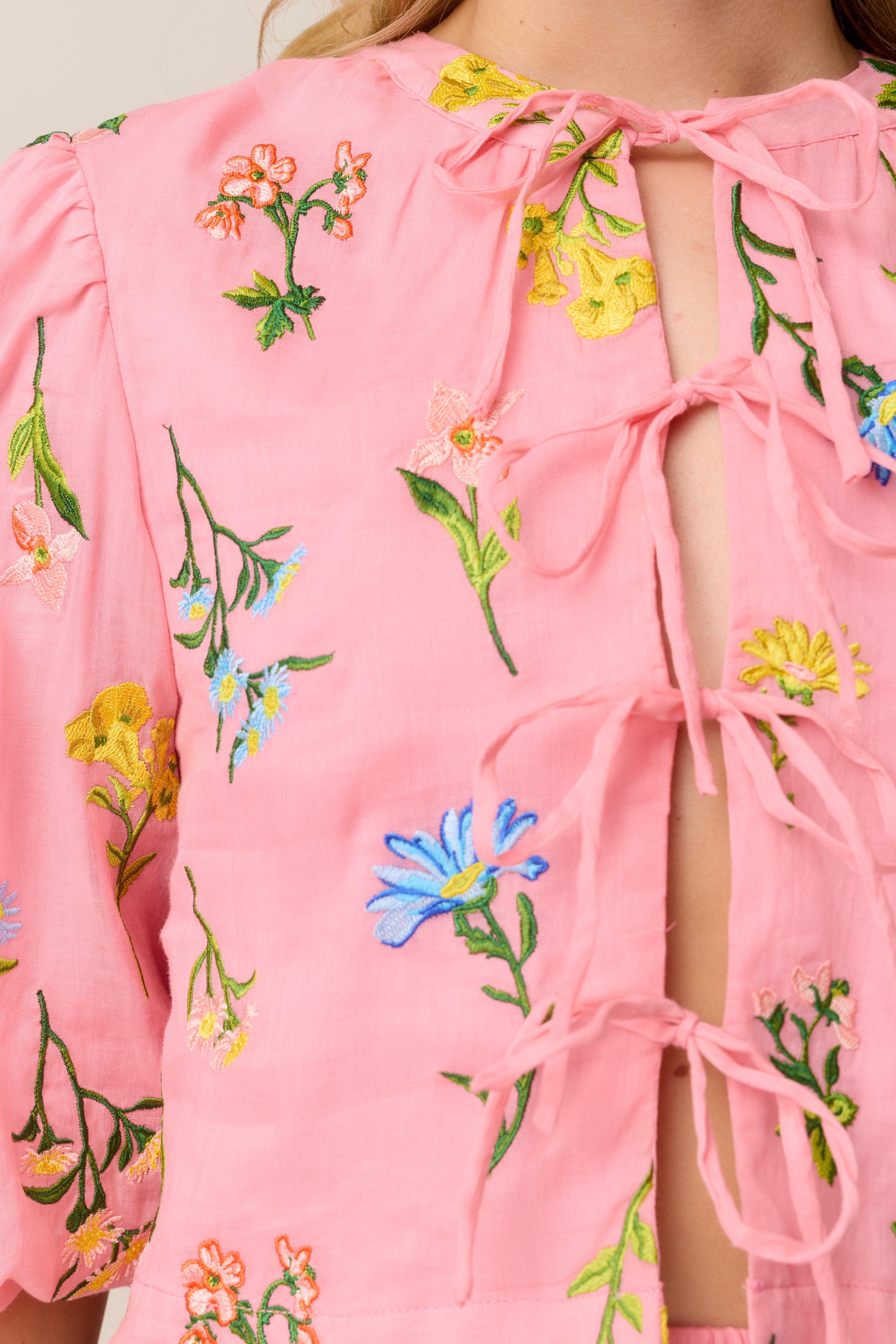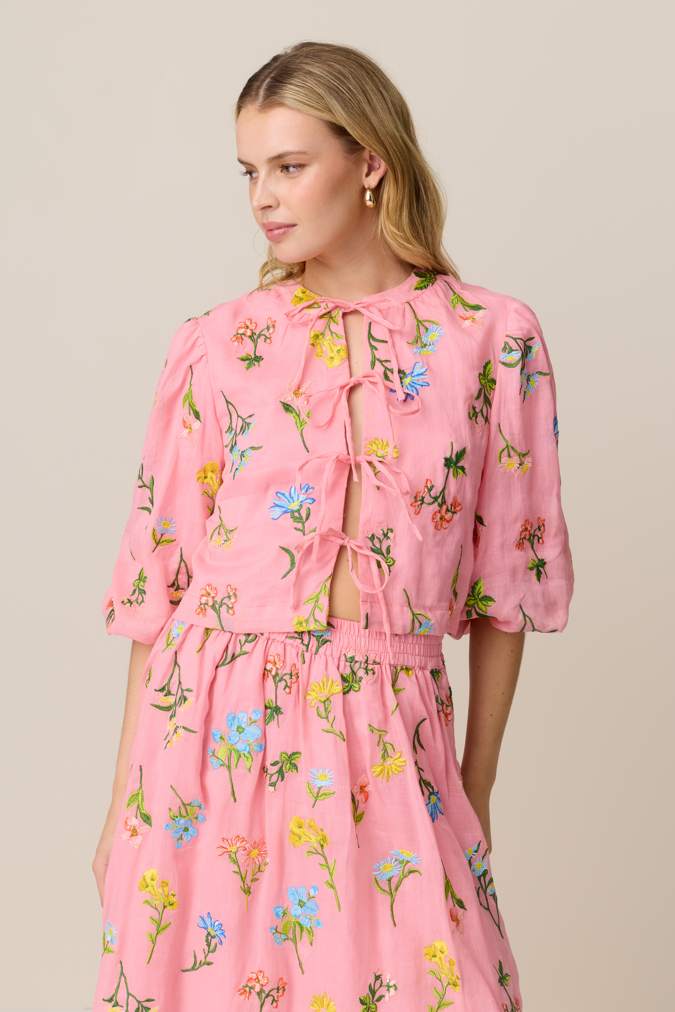 The Suki Blouse is an embroidered, tie front top. It is semi-cropped and intended to finish on the top of your waistband.