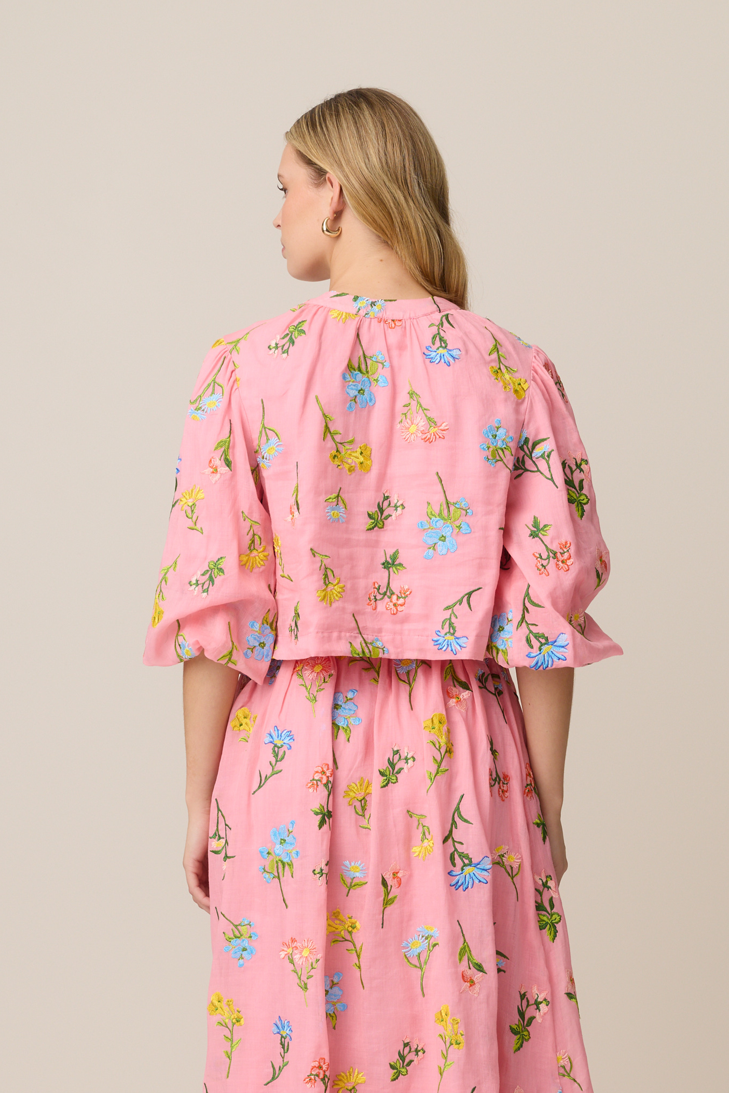 The blouse is made out of 100% Linen and lined with Viscose. It features a custom, VH Embroidery of our 'Blossom' print.