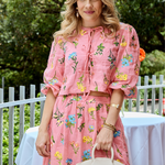 The Suki Blouse is an embroidered, tie front top. It is semi-cropped and intended to finish on the top of your waistband.
