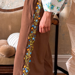 The Column pant is made out of a brown, chocolate coloured Linen Cotton. We have chosen this fabric as it has great drape, is mid-weight for transeasonal wear and is durable. The waistband is in a blue colour and the embroidery on the side panels is yellow, green and blue.