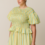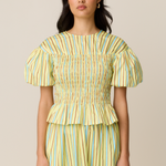 The Fable Blouse is a shirred, balloon sleeved, peplum top.
