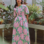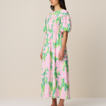The Fable Dress is a shirred, puffed sleeved, midi dress dress.