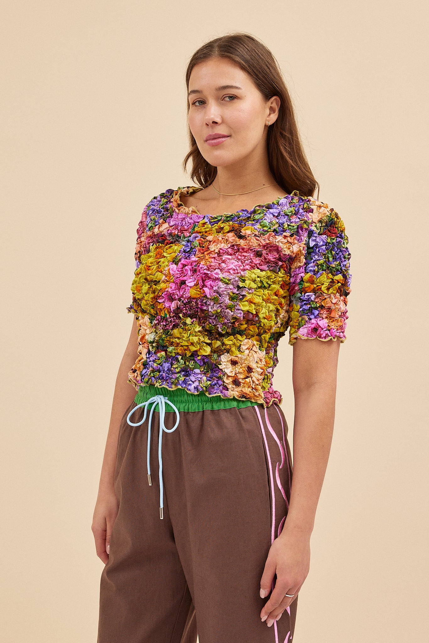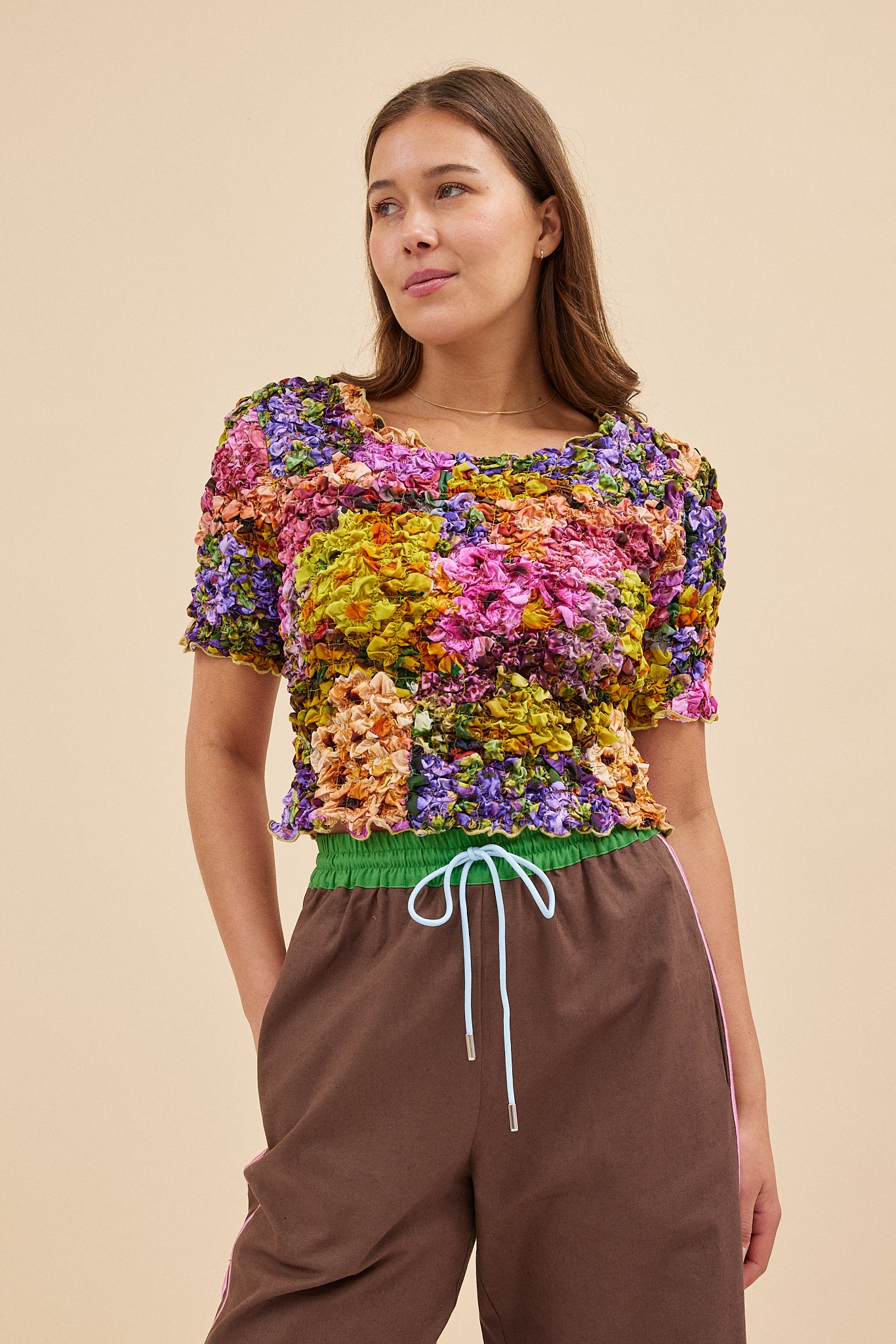 Our new Popcorn Top is a fully shirred, cotton, t-shirt shape in our floral wrap, green stripe.