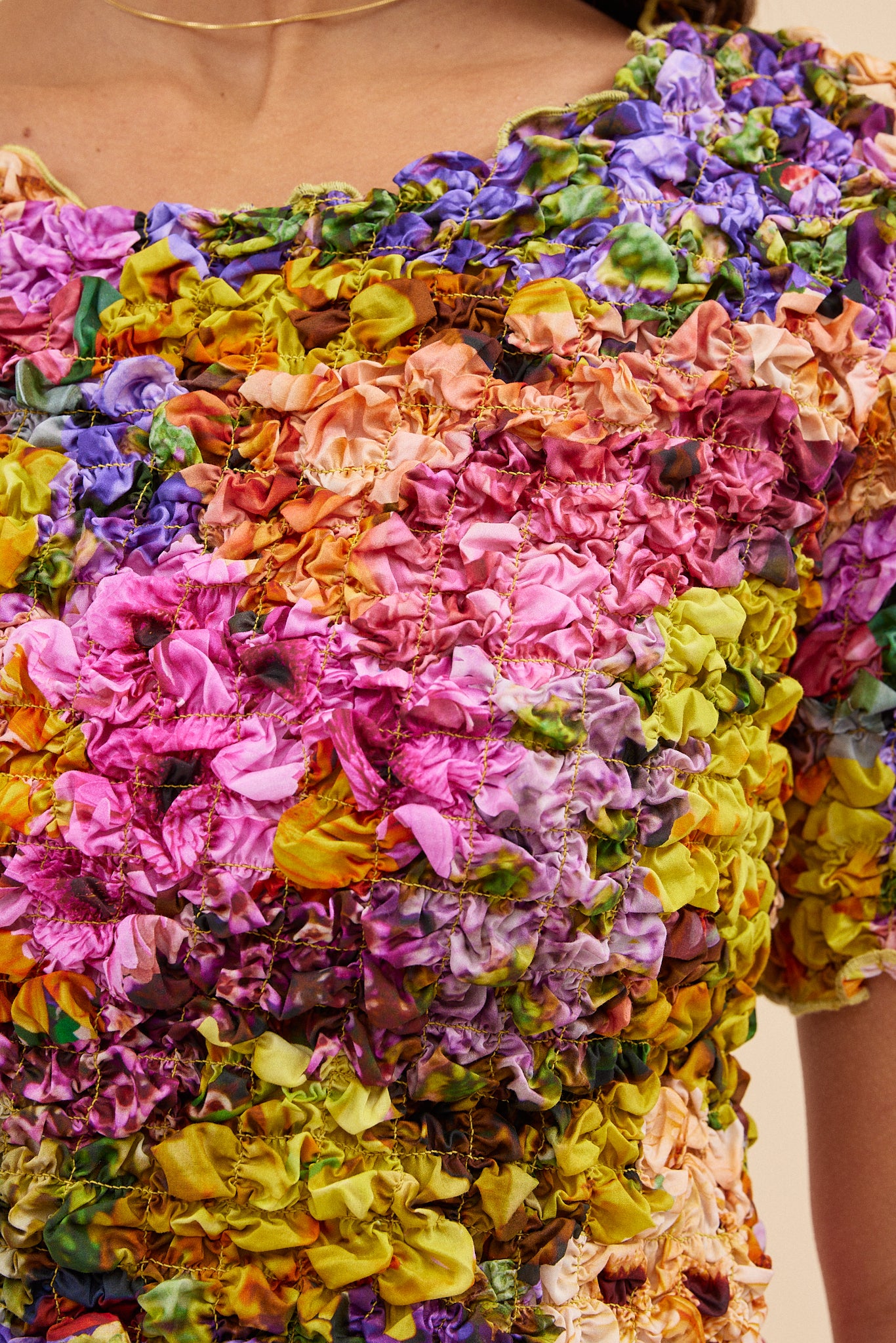 It has a 'popcorn' style shirring which is where the fabric is shirred in two directions, creating a textured effected. The shirring creates a fitted but smoothing/flattering look across the body (no hugging!)