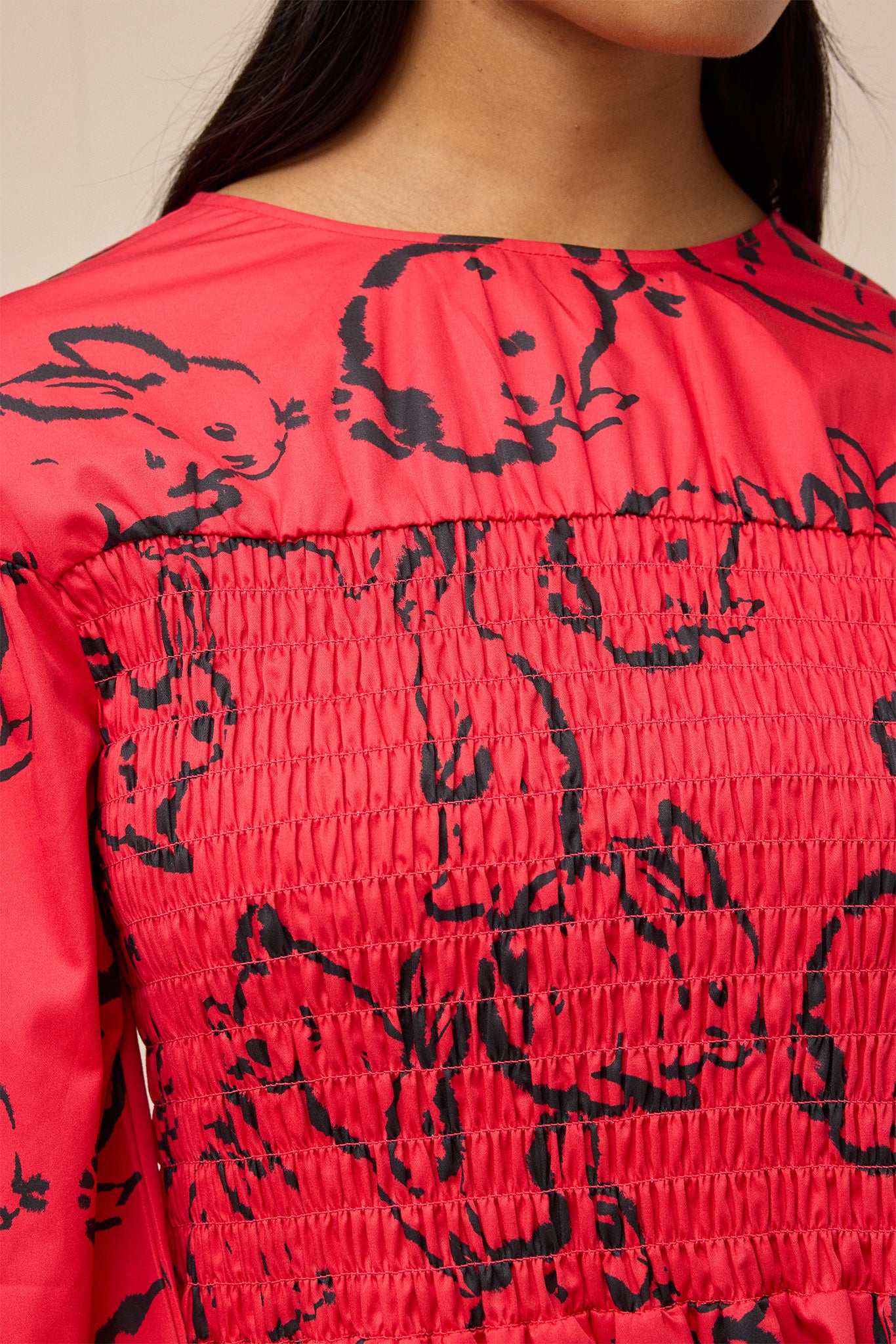 It has a dully shirred bodice for ease of fit and has beautiful, gathering detail above the shirring panel.
