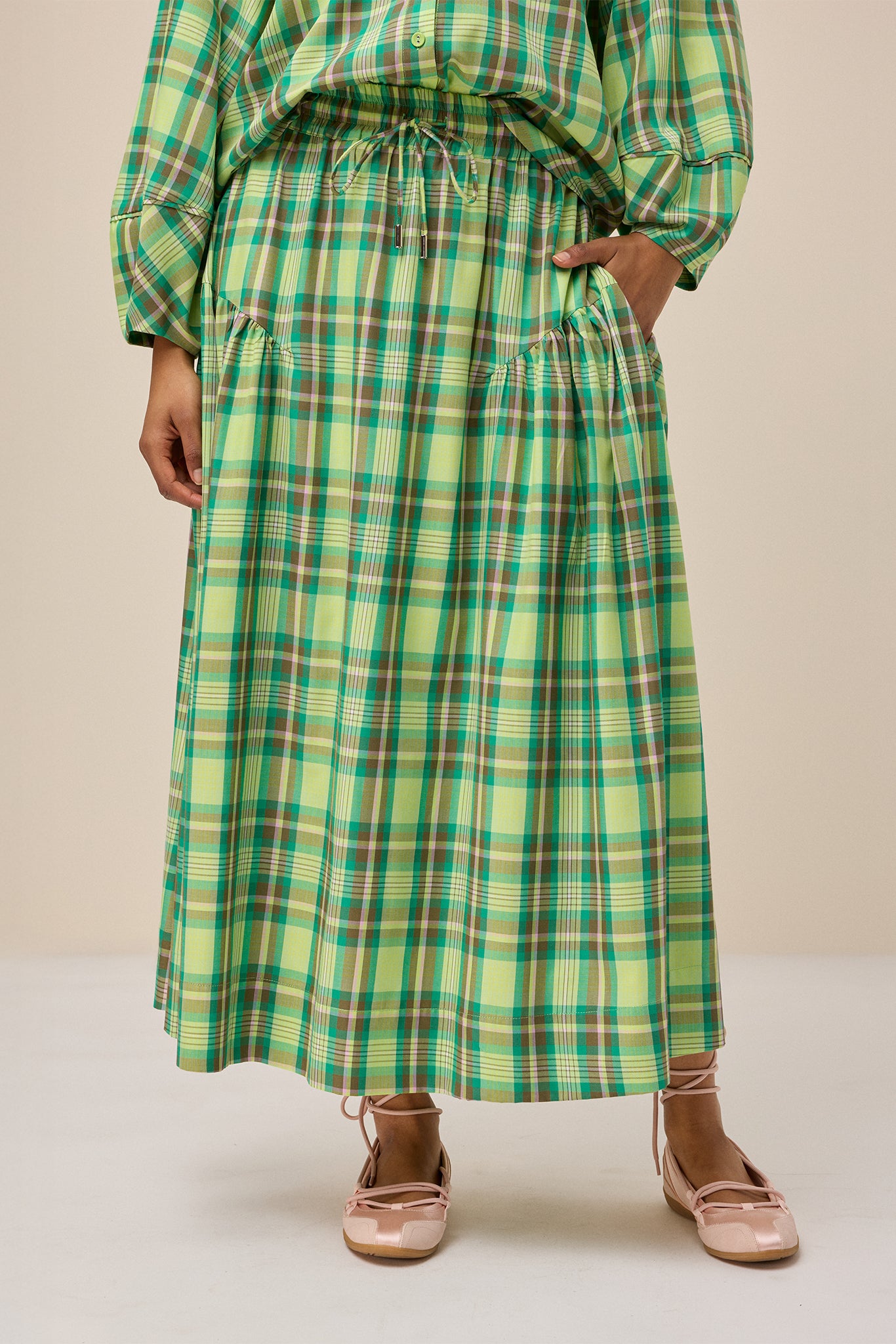It has a fully elasticated waist with and a matching plaid drawstring finished with silver hardware.