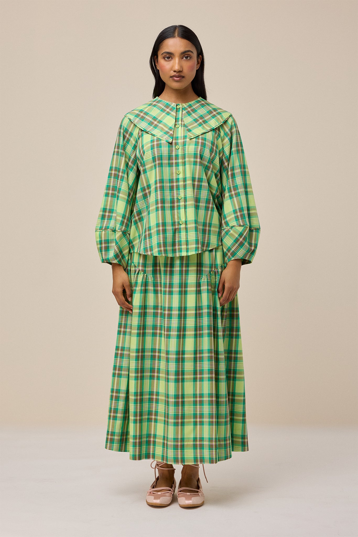 The Matilda skirt is a a-line, midi skirt shape. It features side seams with gathering for extra drape and flounce through the skirt.
