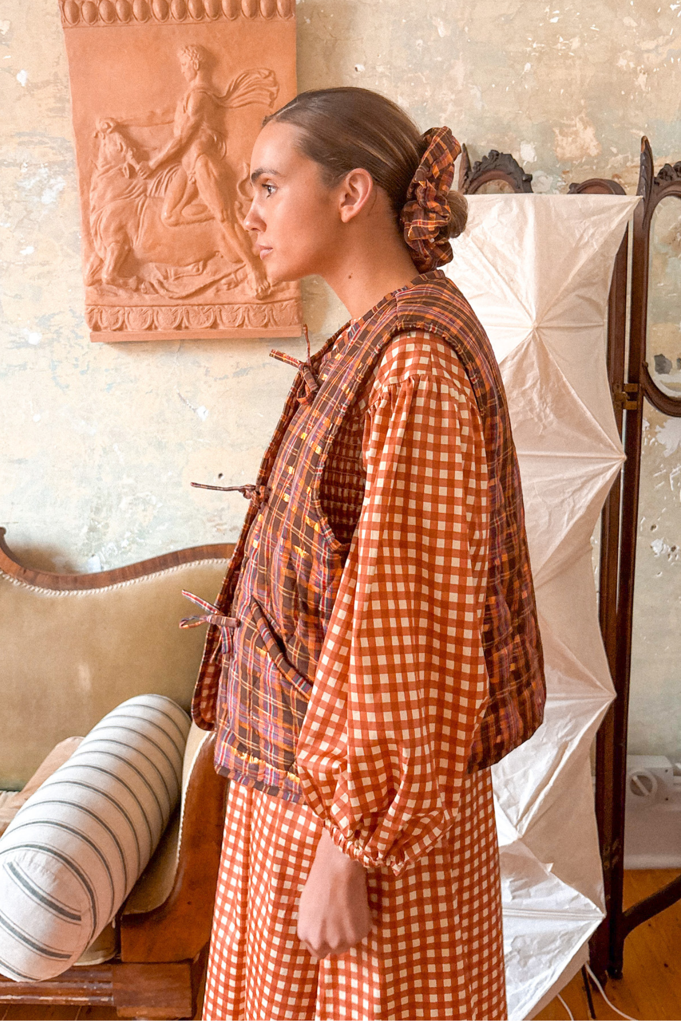 It is 100% quilted and reversible, providing two vests in one. The outer features our Picket Fence Plaid fabric and the inner is printed in our Haybell Gingham print.