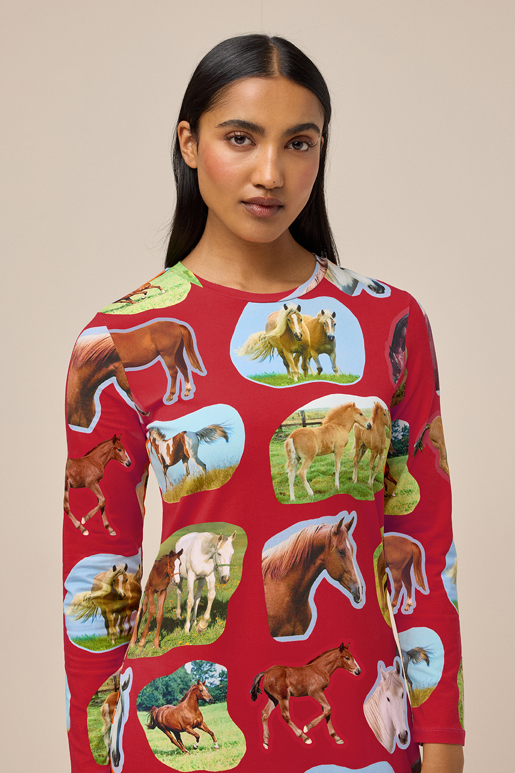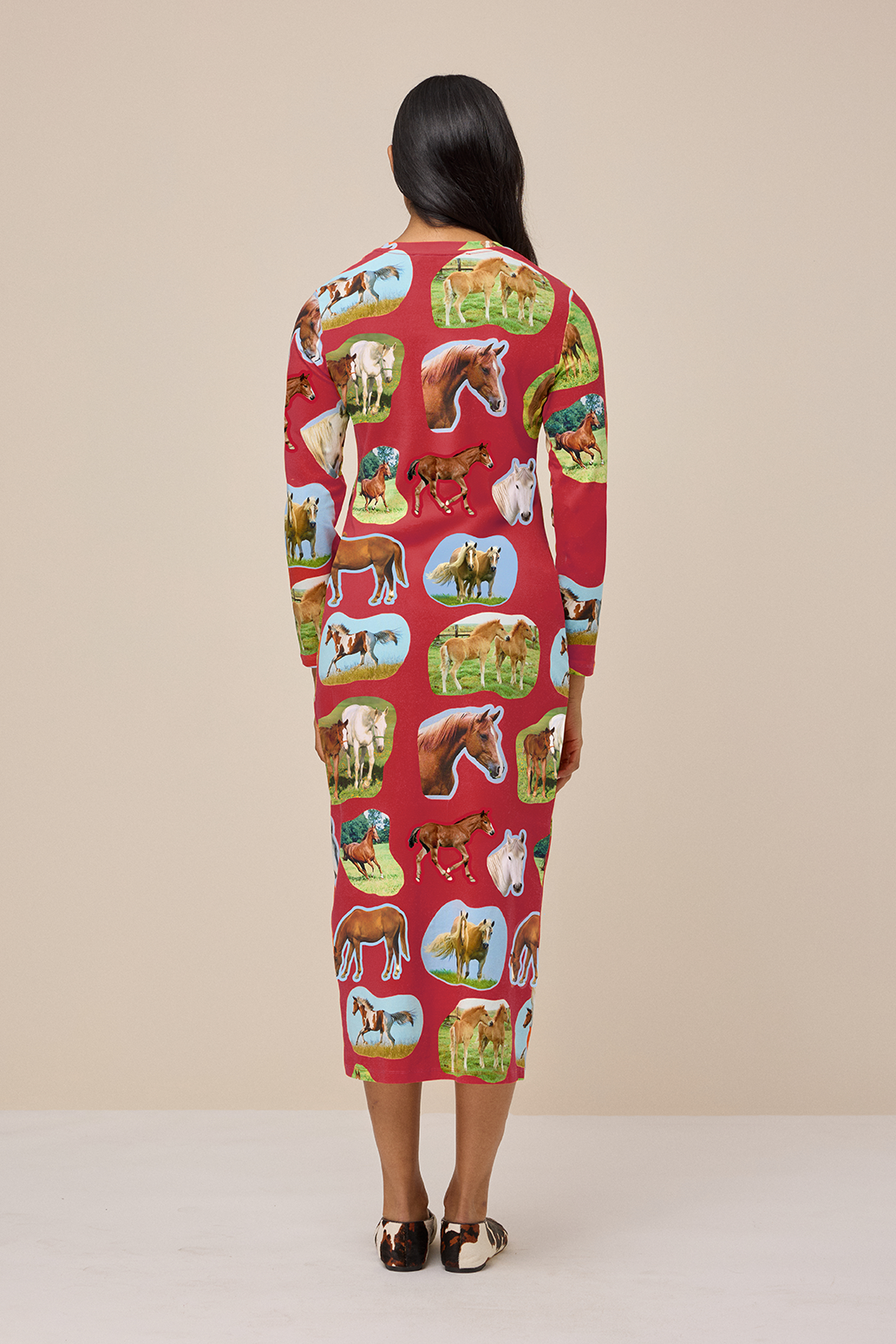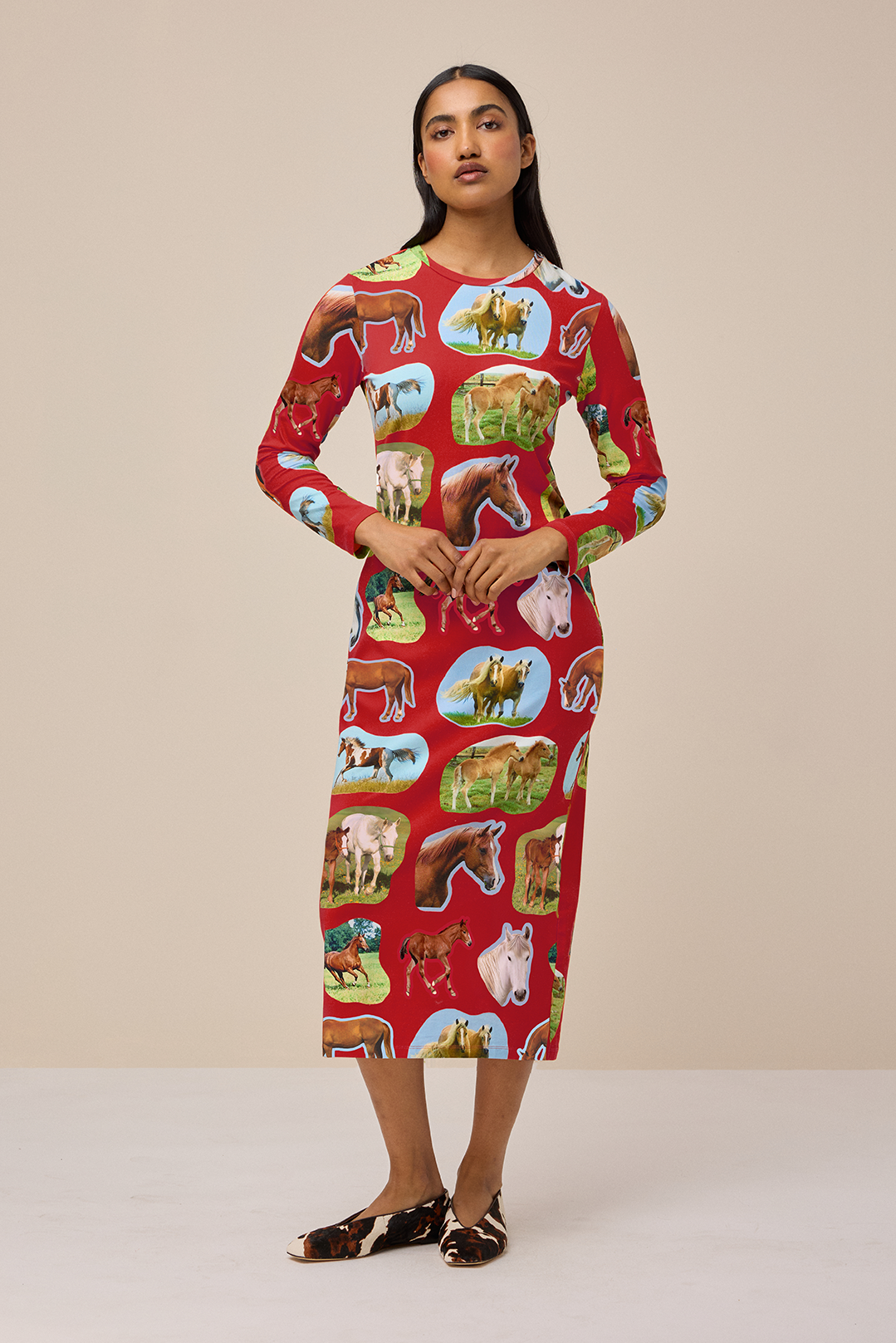 Not only do I LOVE this dress, but it made so many other people happy too. I am a huge fan of the sunny dress (I have a few), such comfort, quality materials, great fit hugging in all the right places. The print is magnificent, striking colours, clear images, cutesy pie horses. Chefs kiss. Snap it up people!