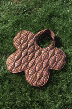 It is made out of a Metallic Polyester blend fabrication in a chocolate, coffee, pink and rose gold metallic woven plaid design.