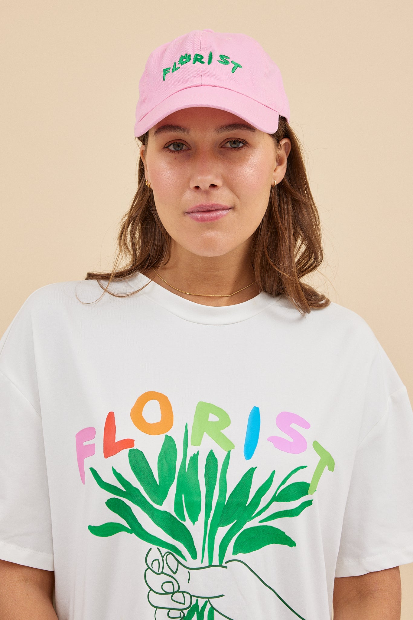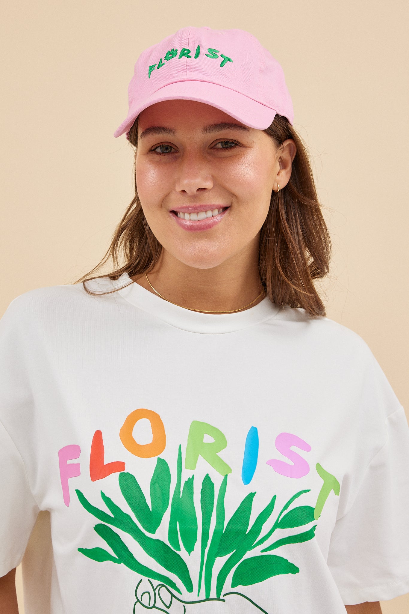 Peony pink unisex cap with butter 'FLORIST' embroidery. Adjustable back.