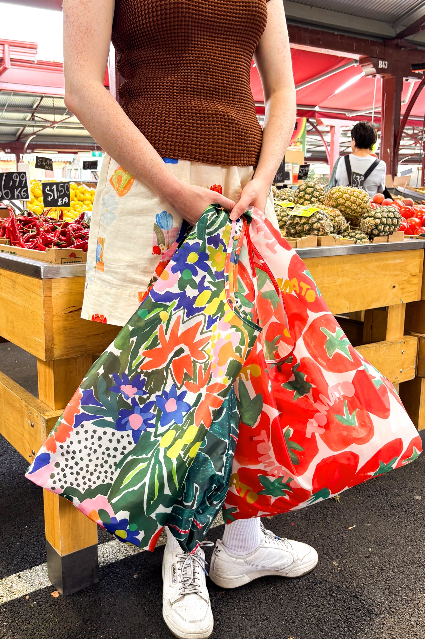 - 3 reusable shopping bags in Croc, Tomato and Terra Flora prints