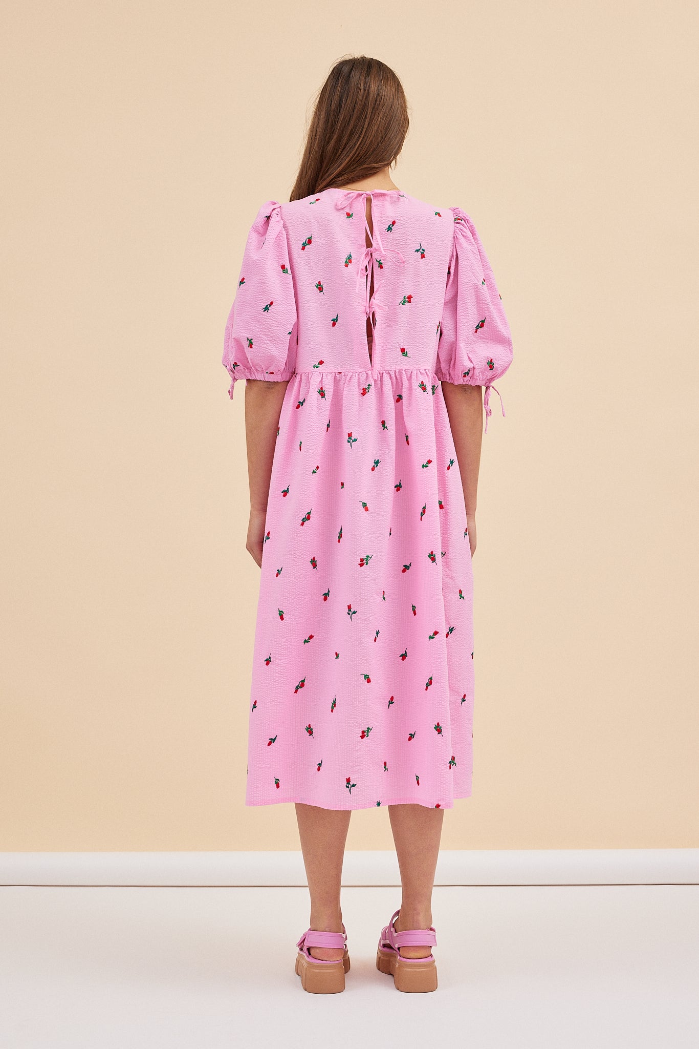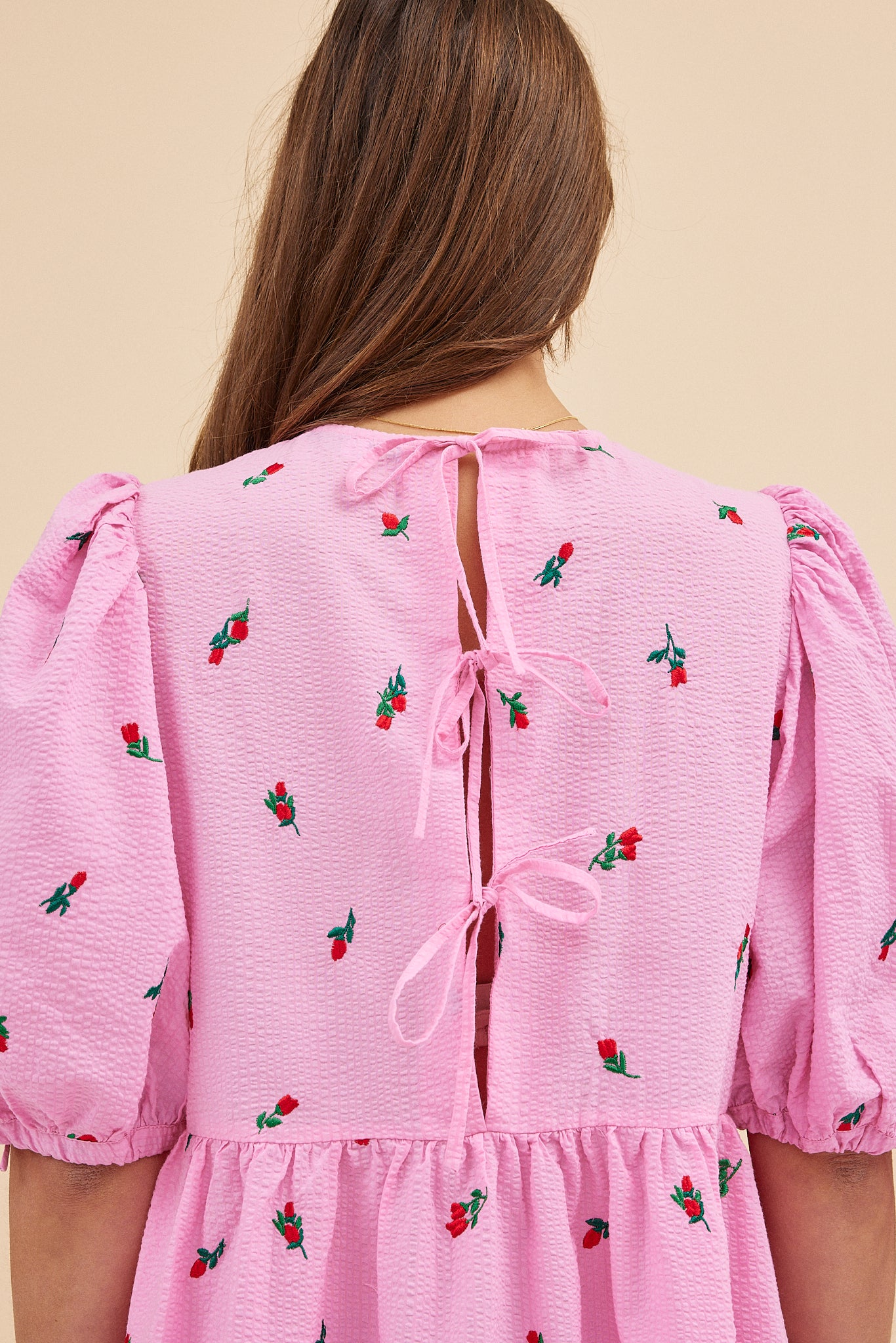 It has a triple tie closure on the back of the dress and puffed sleeves that are also finished with adjustable ties; this means you can loosen or tighten depending on your arm measurement.