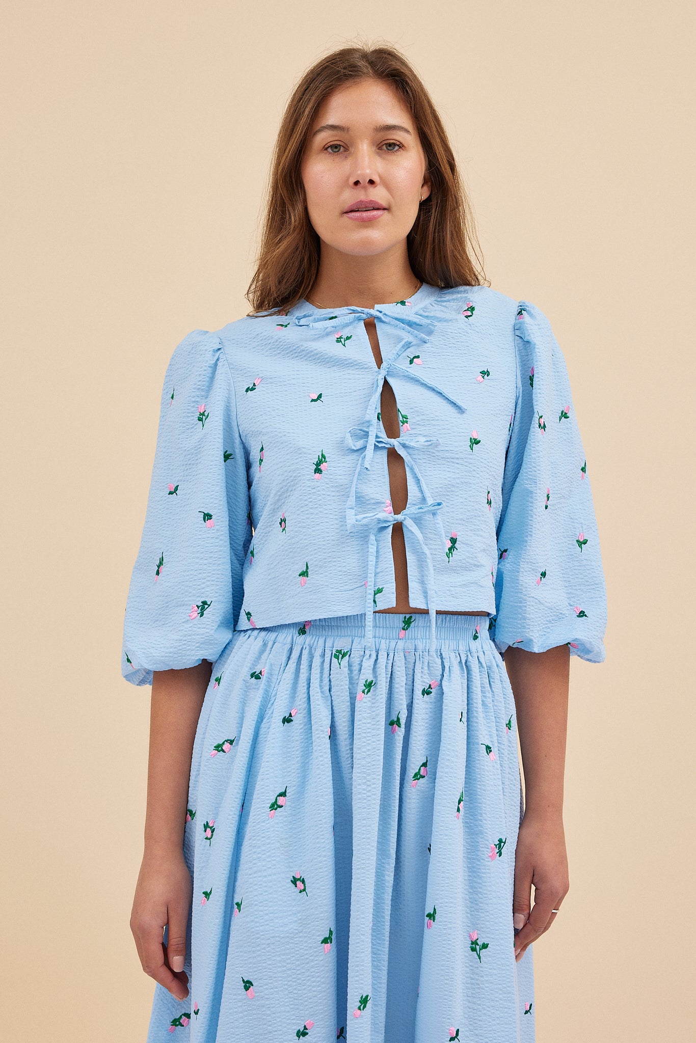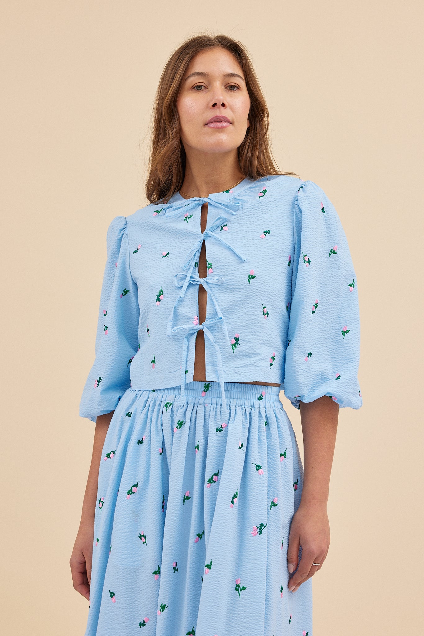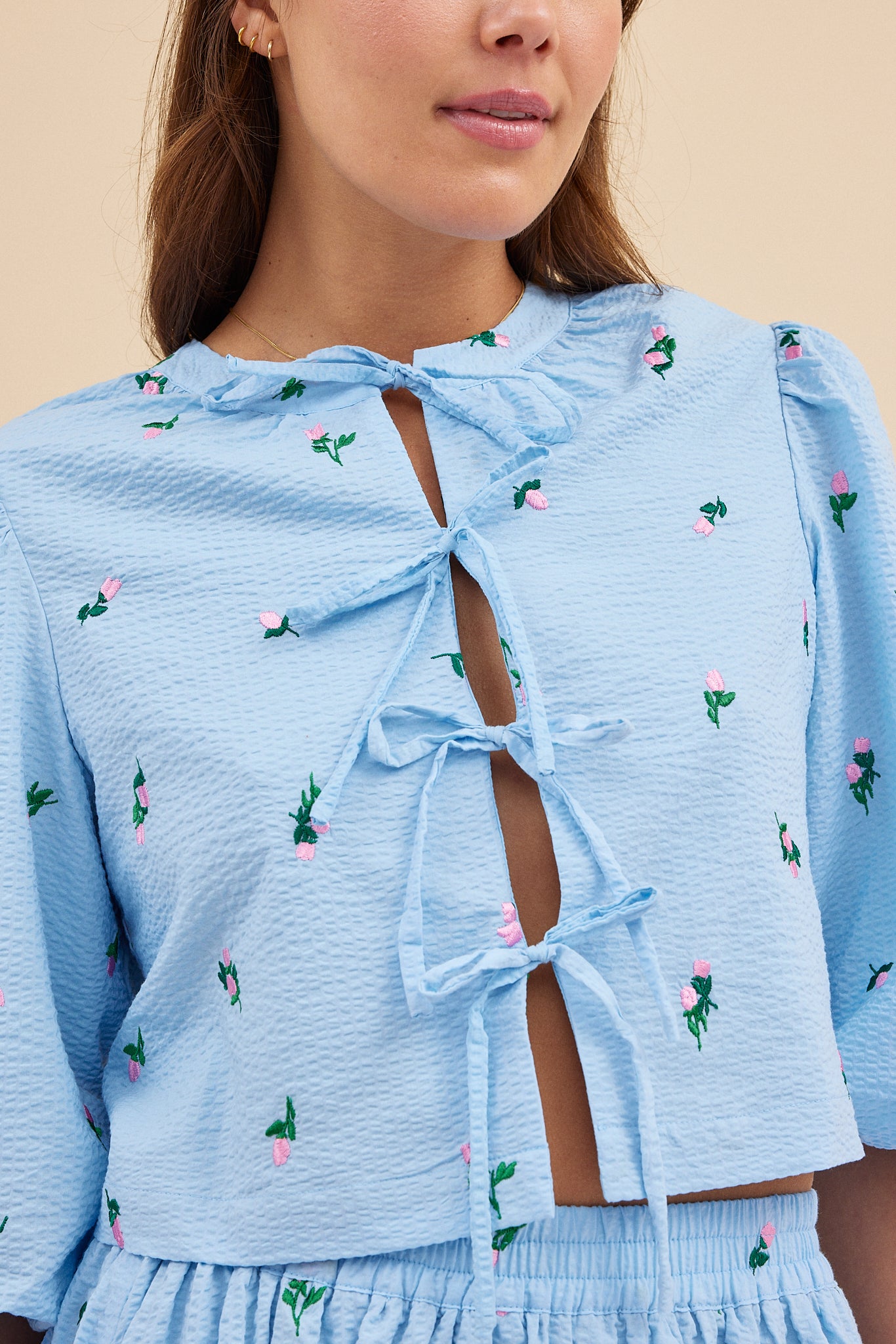 The Suki Blouse is an embroidered, tie front top. It is semi-cropped and intended to finish on the top of your waistband.