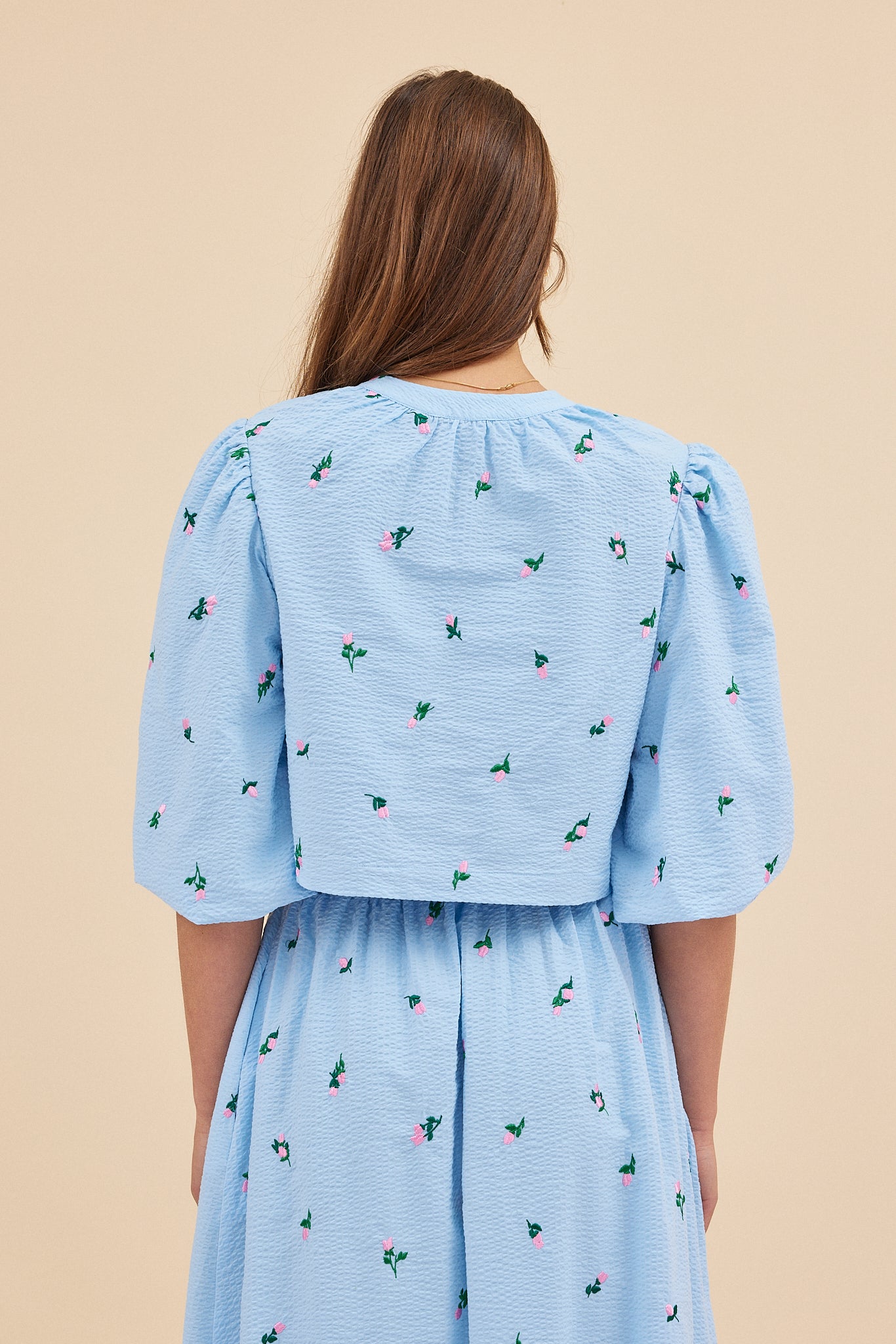 The blouse is made out of 100% Cotton Seersucker and lined with Viscose. It features a custom, VH Embroidery of our 'Roses' print.