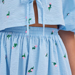 This skirt is made of 100% Cotton Seersucker, lined with Viscose and embroidered in a custom, VH patterned embroidery