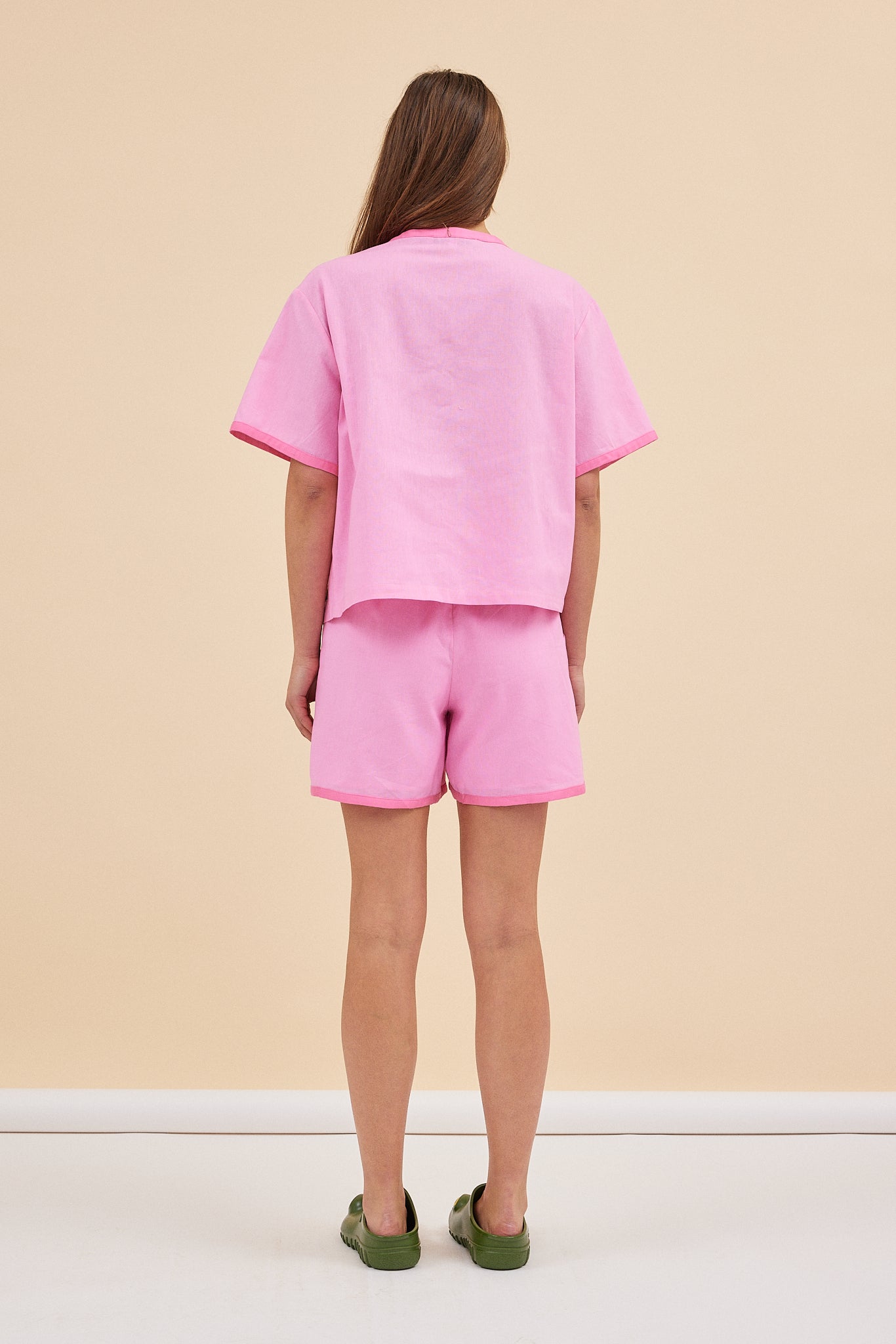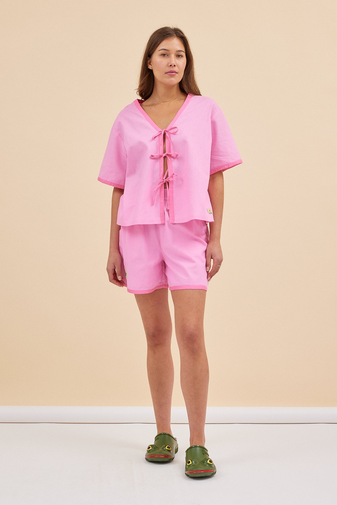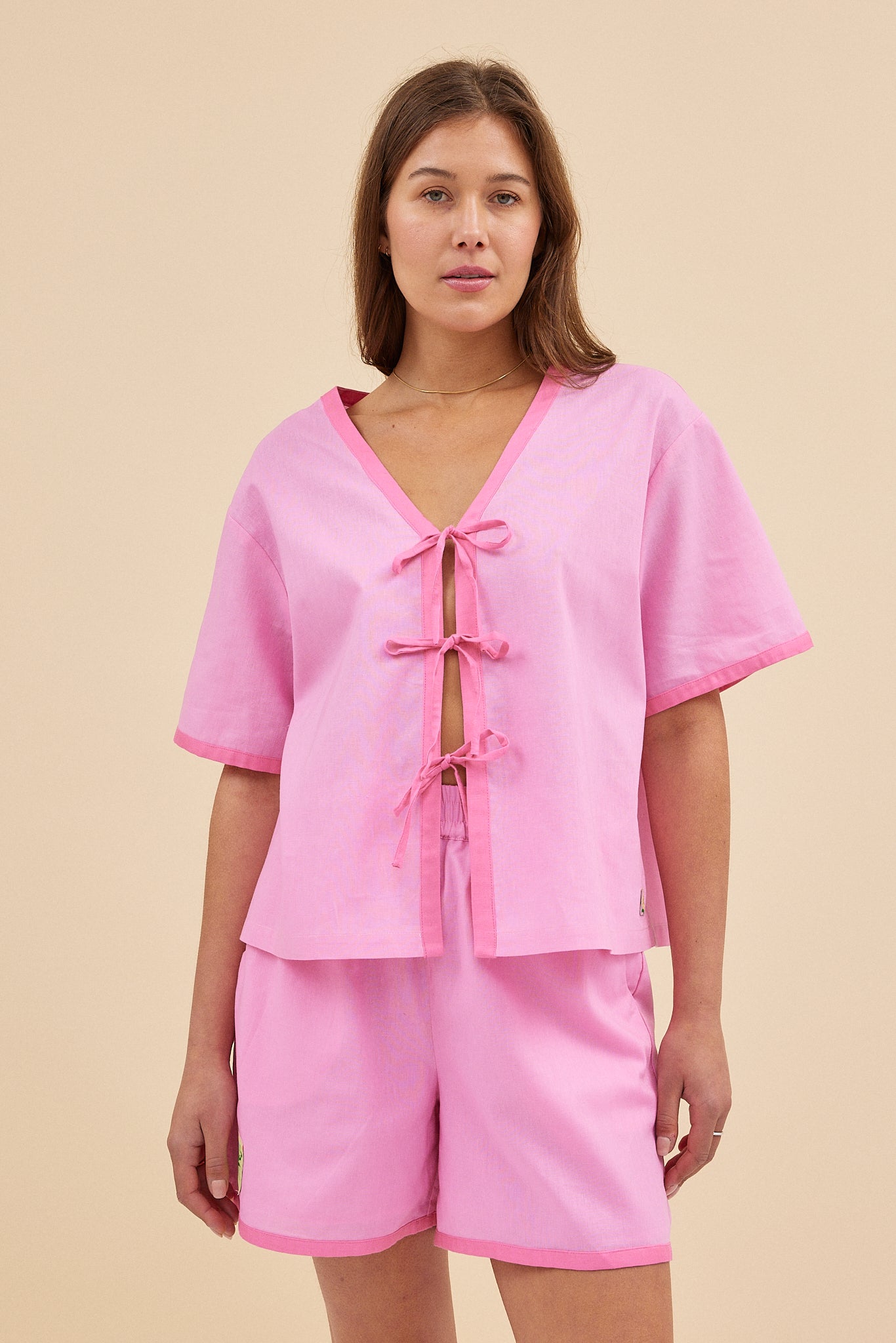 Our new Daisy Tie Top is a boxy, drop-shoulder shirt made out of Linen Cotton.