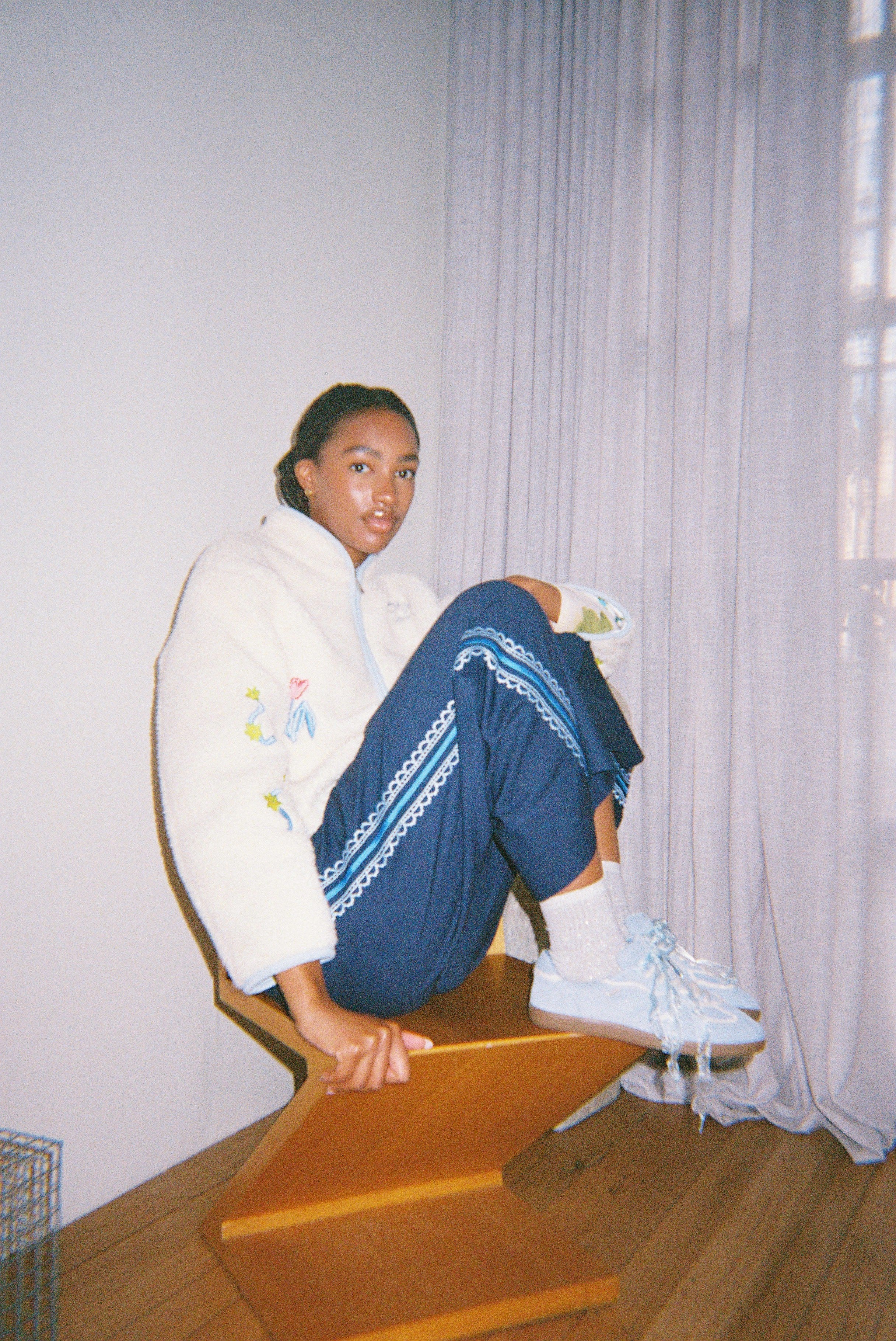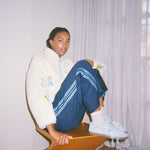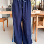 The Column Pant is a wide leg, relaxed pant shape with embroidered panels. They feature a custom VH embroidery design on the side of each pant leg inspired by vintage lace.