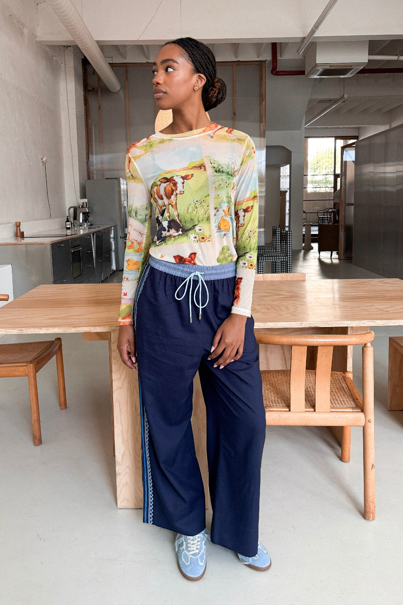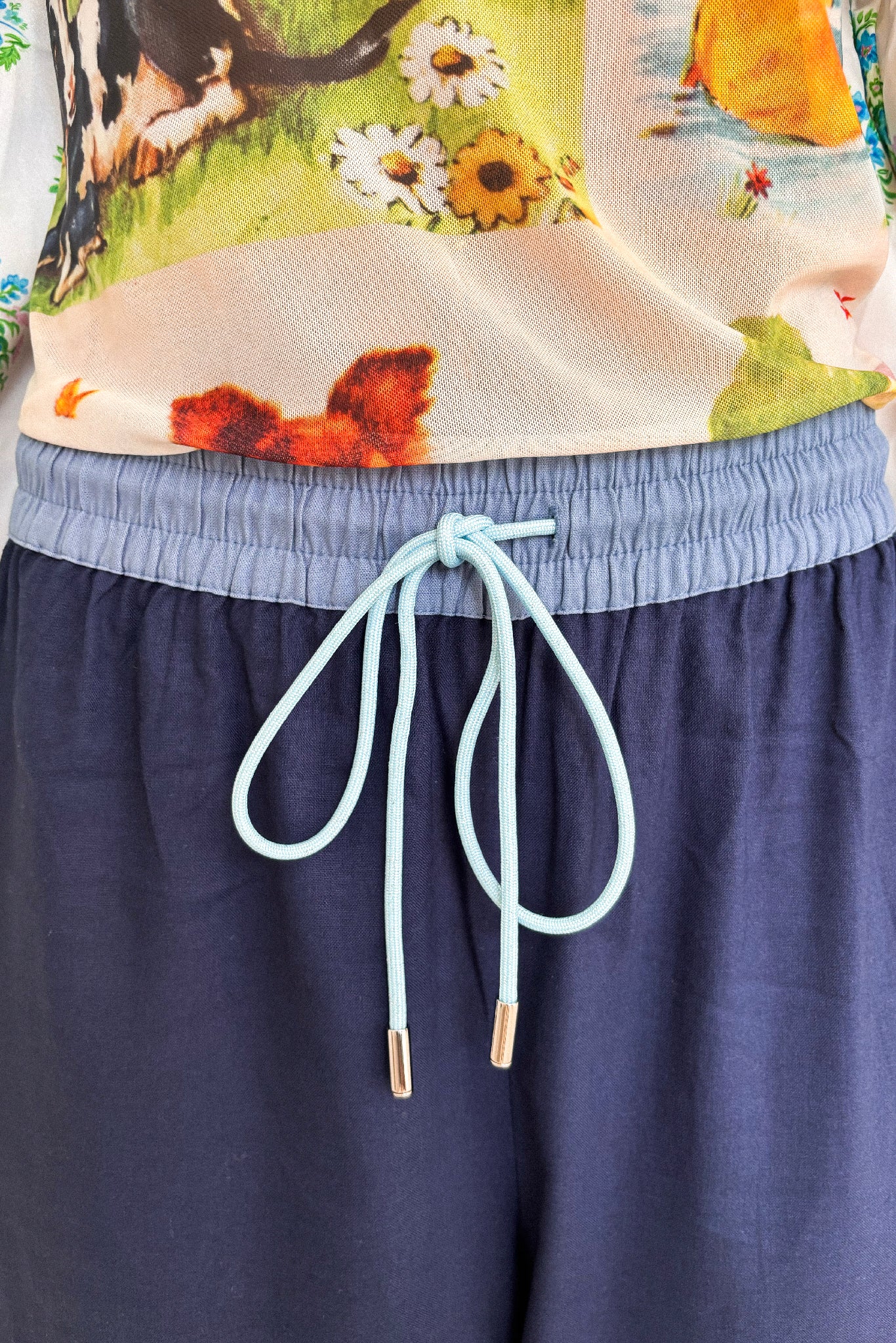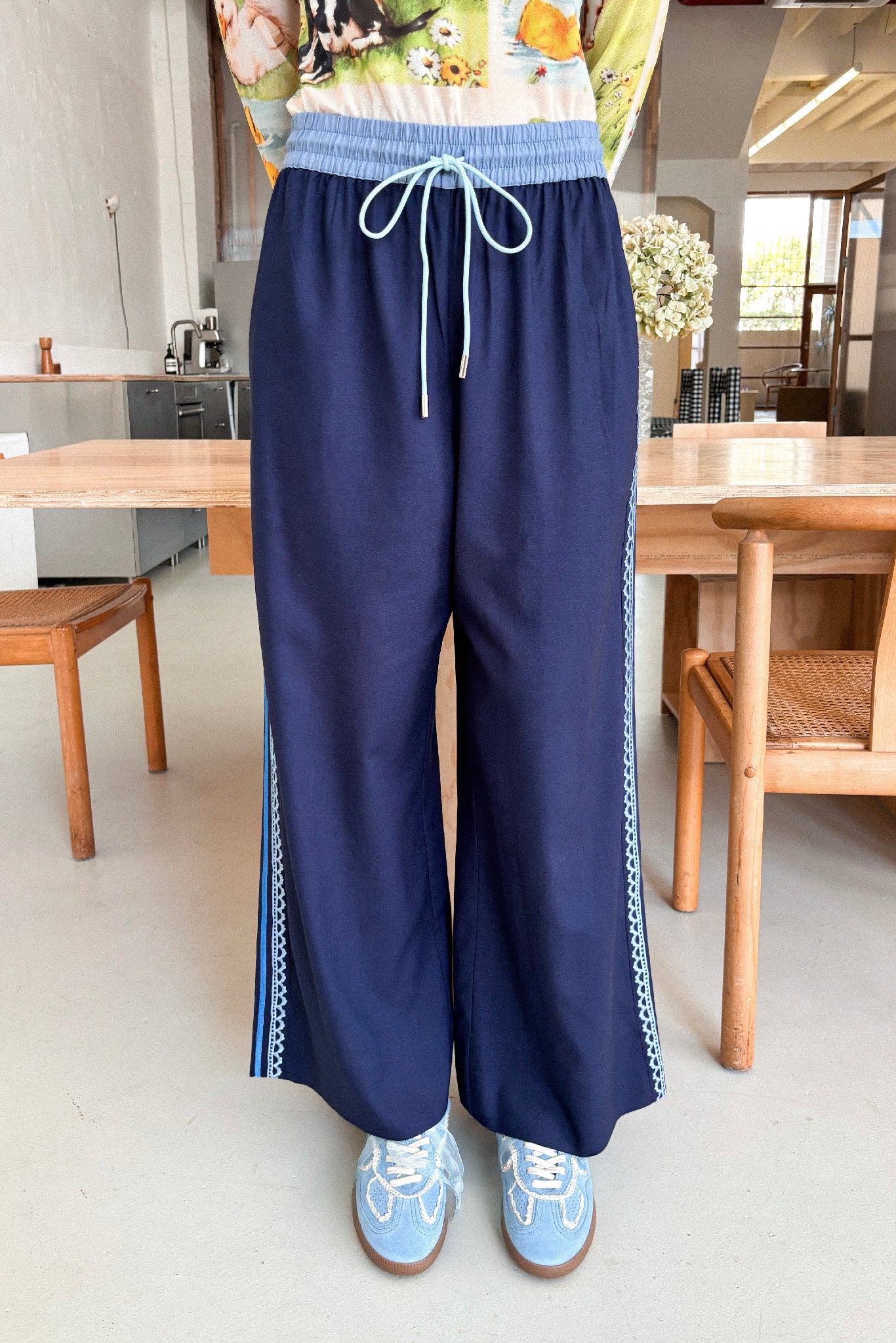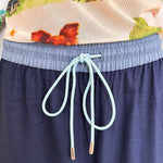 They are designed to be worn high waisted and have a fully elasticated waist with a contrast, blue drawstring finished with silver hard wear. The length finishes at the ankle. Most importantly, they have pockets.