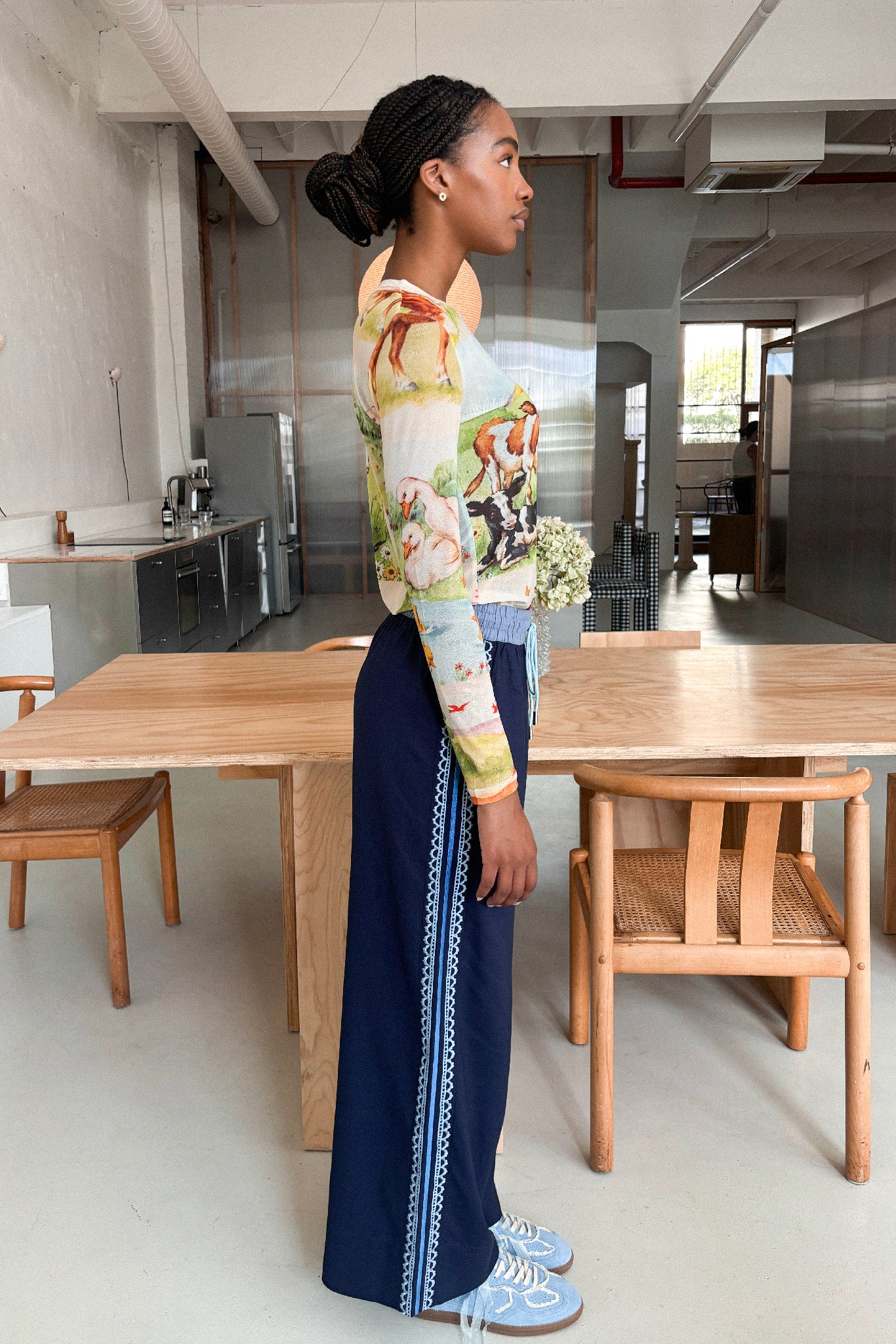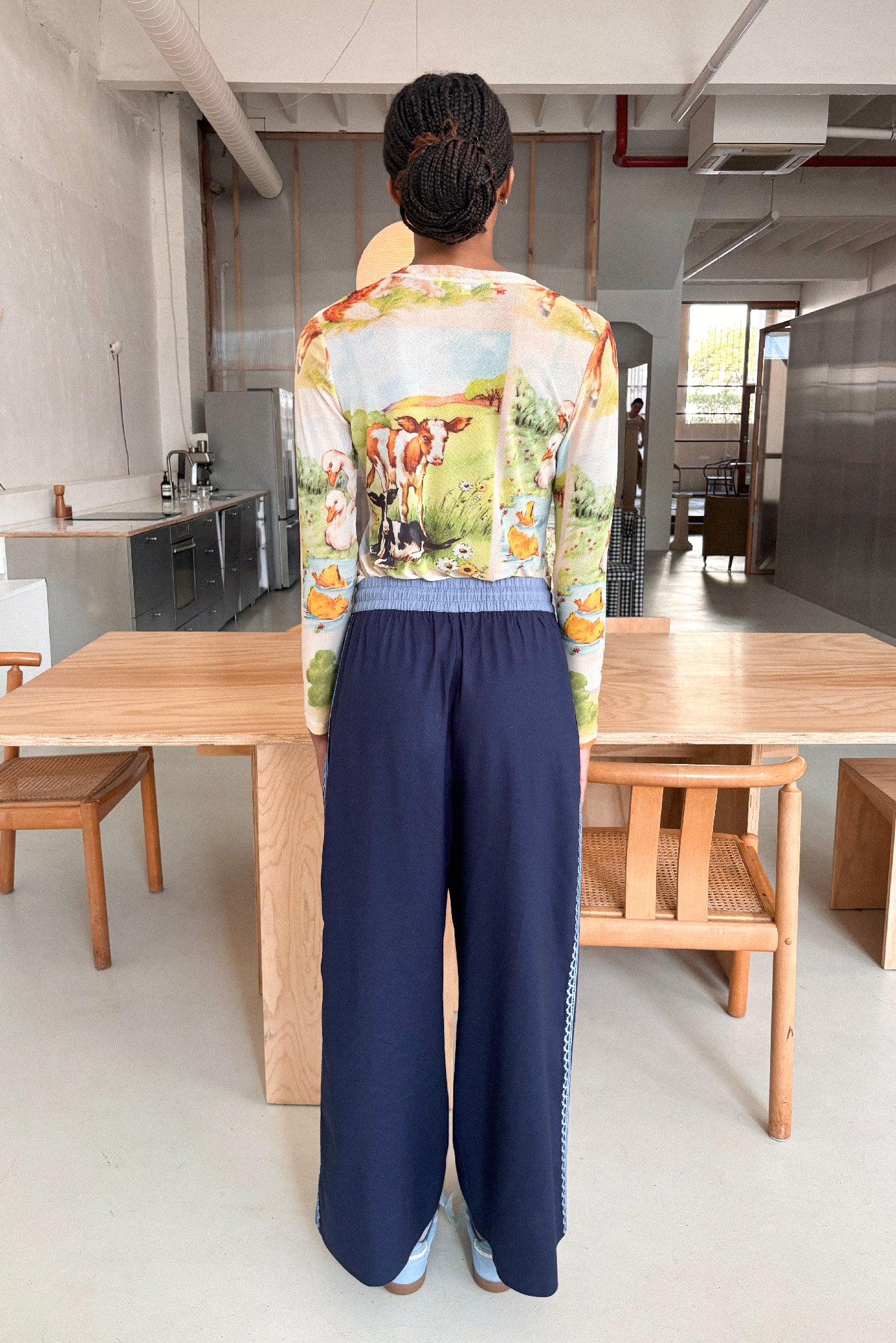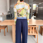 The Column pant is made out of a indigo blue coloured Linen Cotton. We have chosen this fabric as it has great drape, is mid-weight for transeasonal wear and is durable. The waistband is a contrasting sky blue colour, and the embroidery panel in tonal shades of blue.