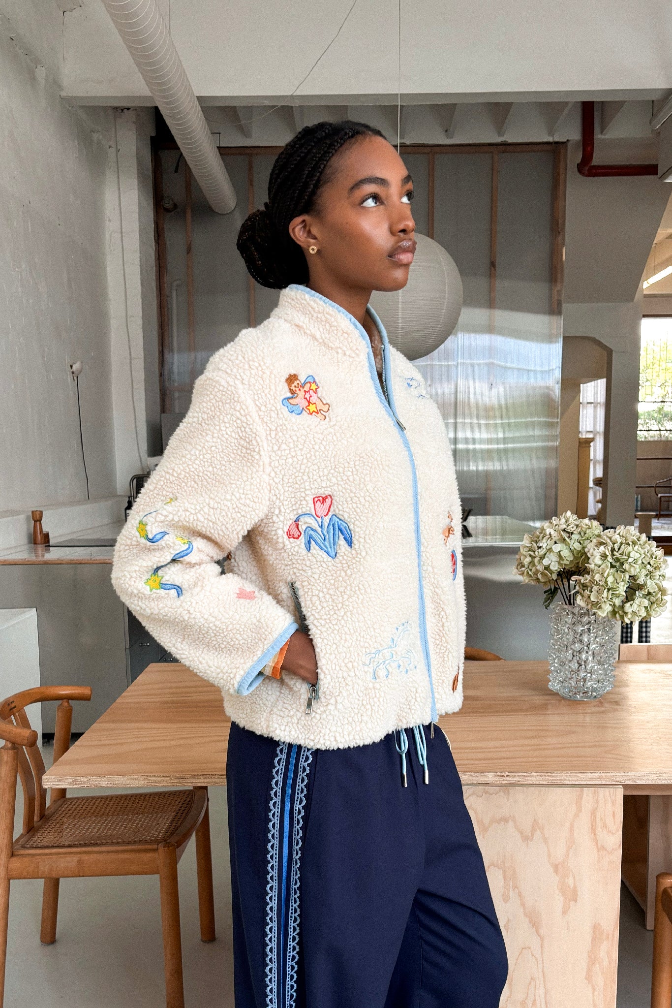 Crafted from a warm blend of 50% wool and 50% recycled polyester, it features custom placement embroidery - with each motif thoughtfully positioned to remain consistent across every jacket.