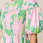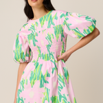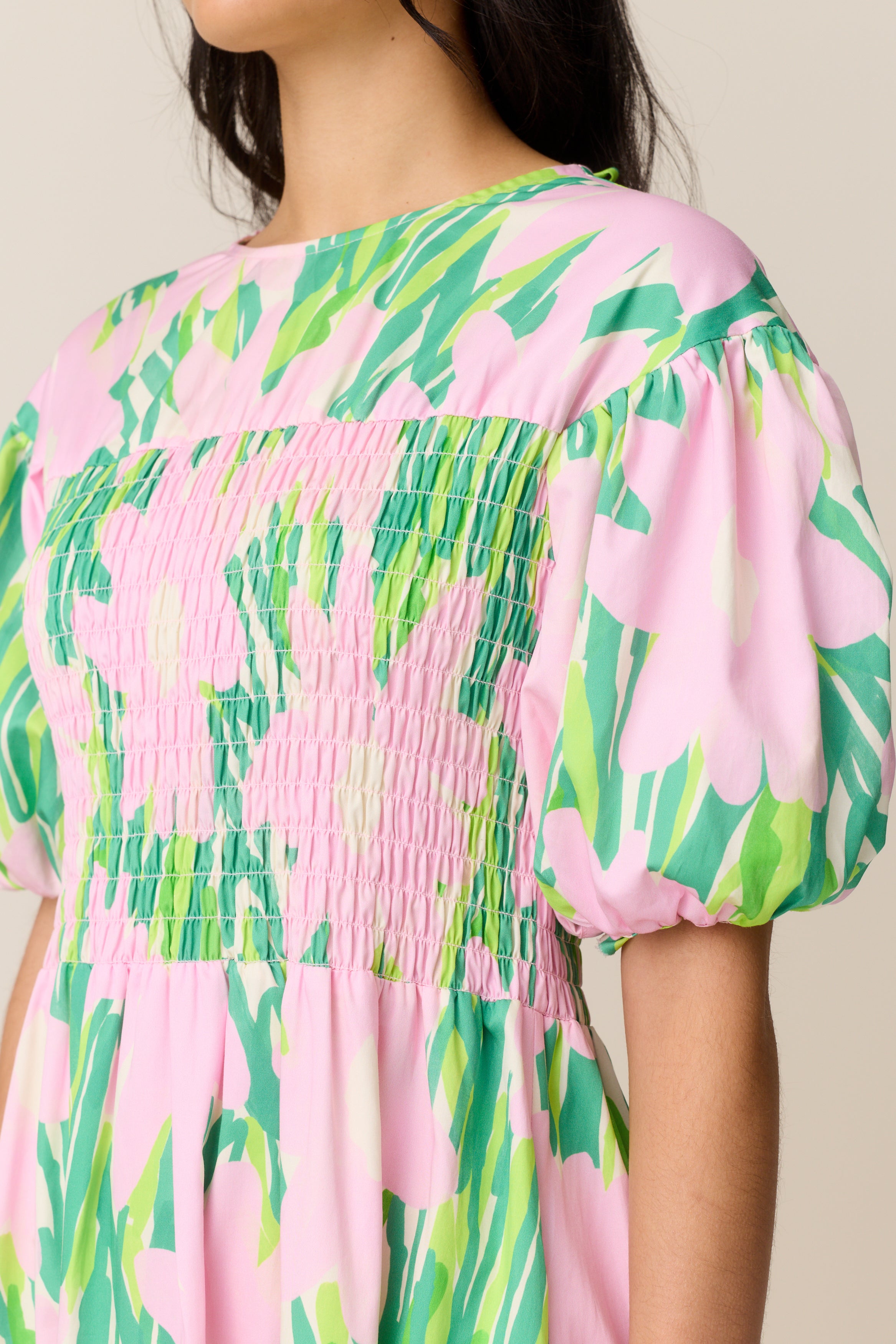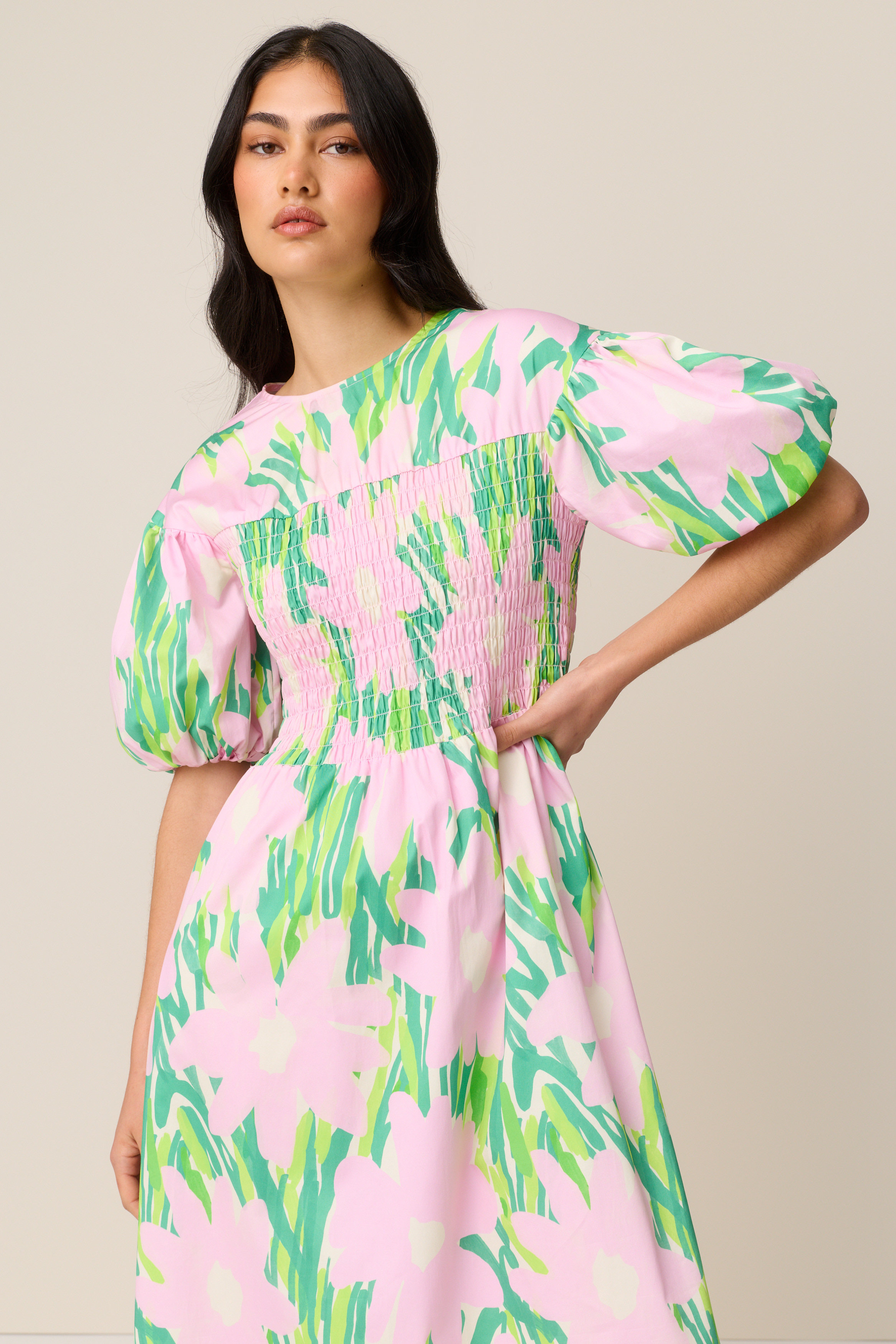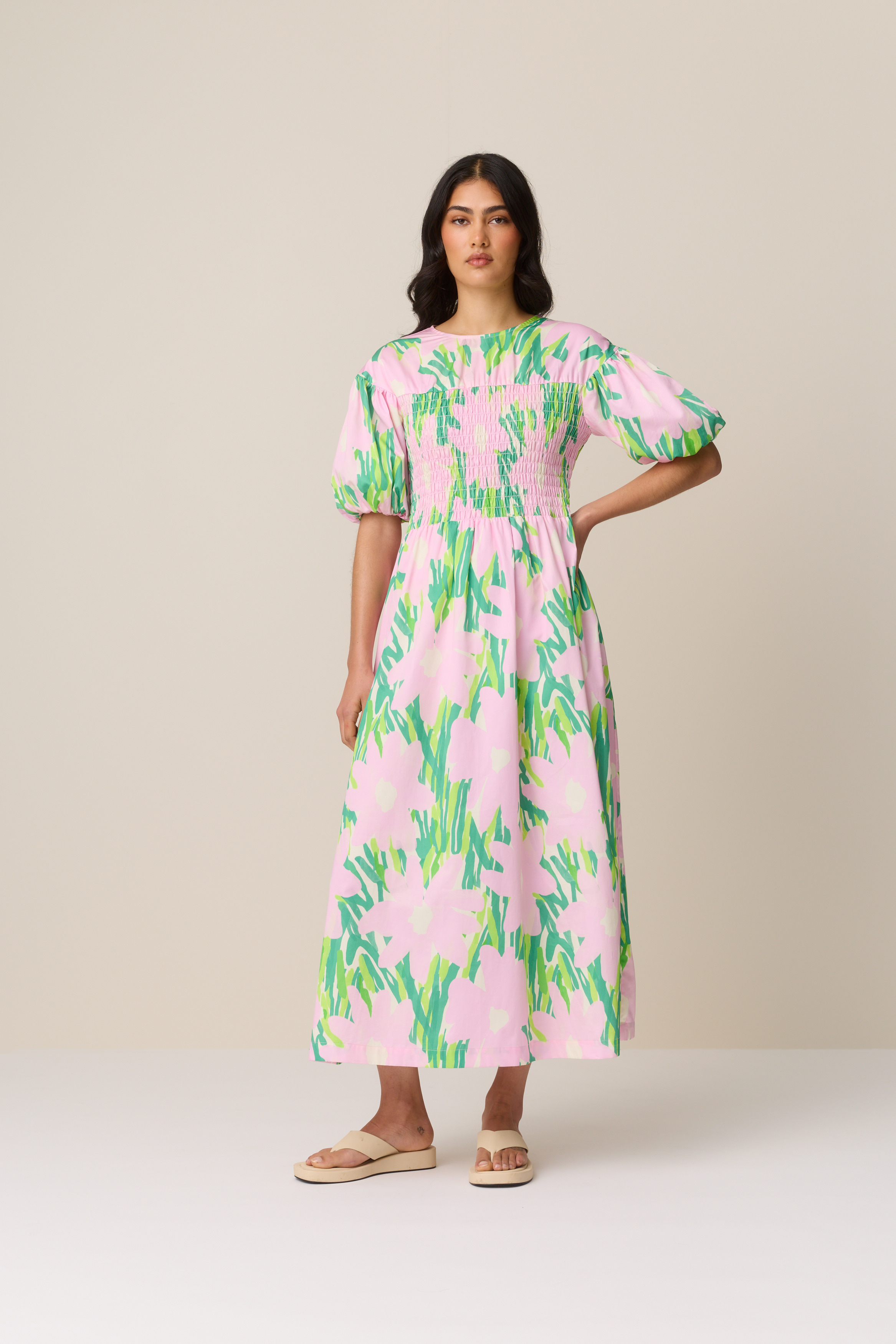 The Fable Dress is a shirred, puffed sleeved, midi dress dress.
