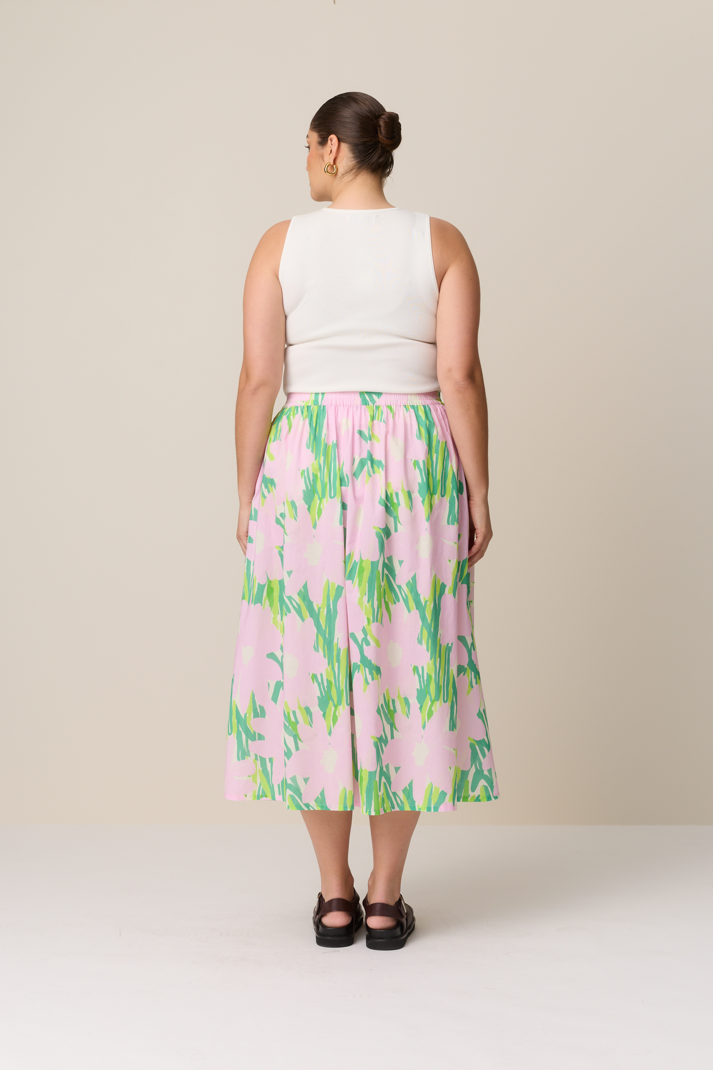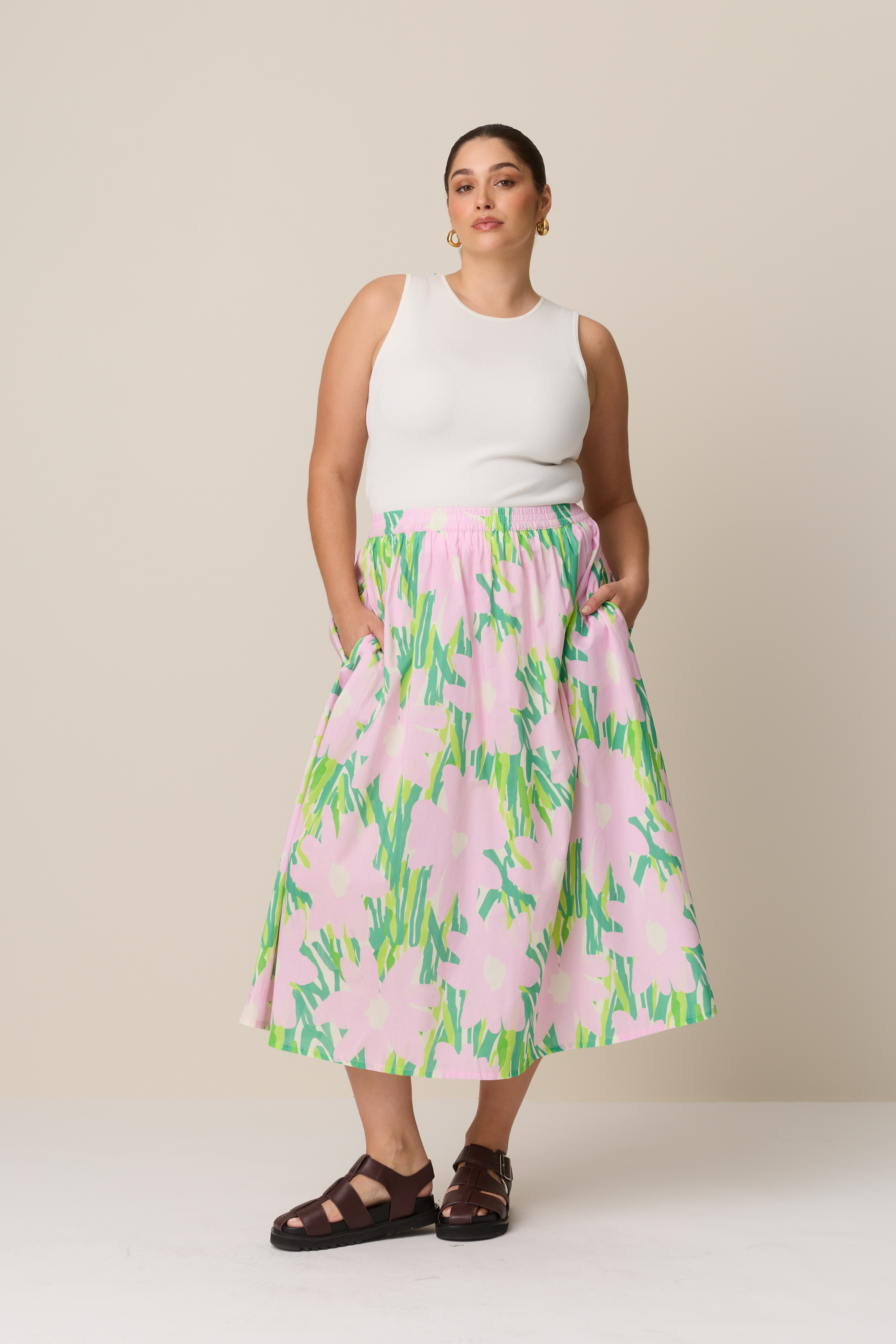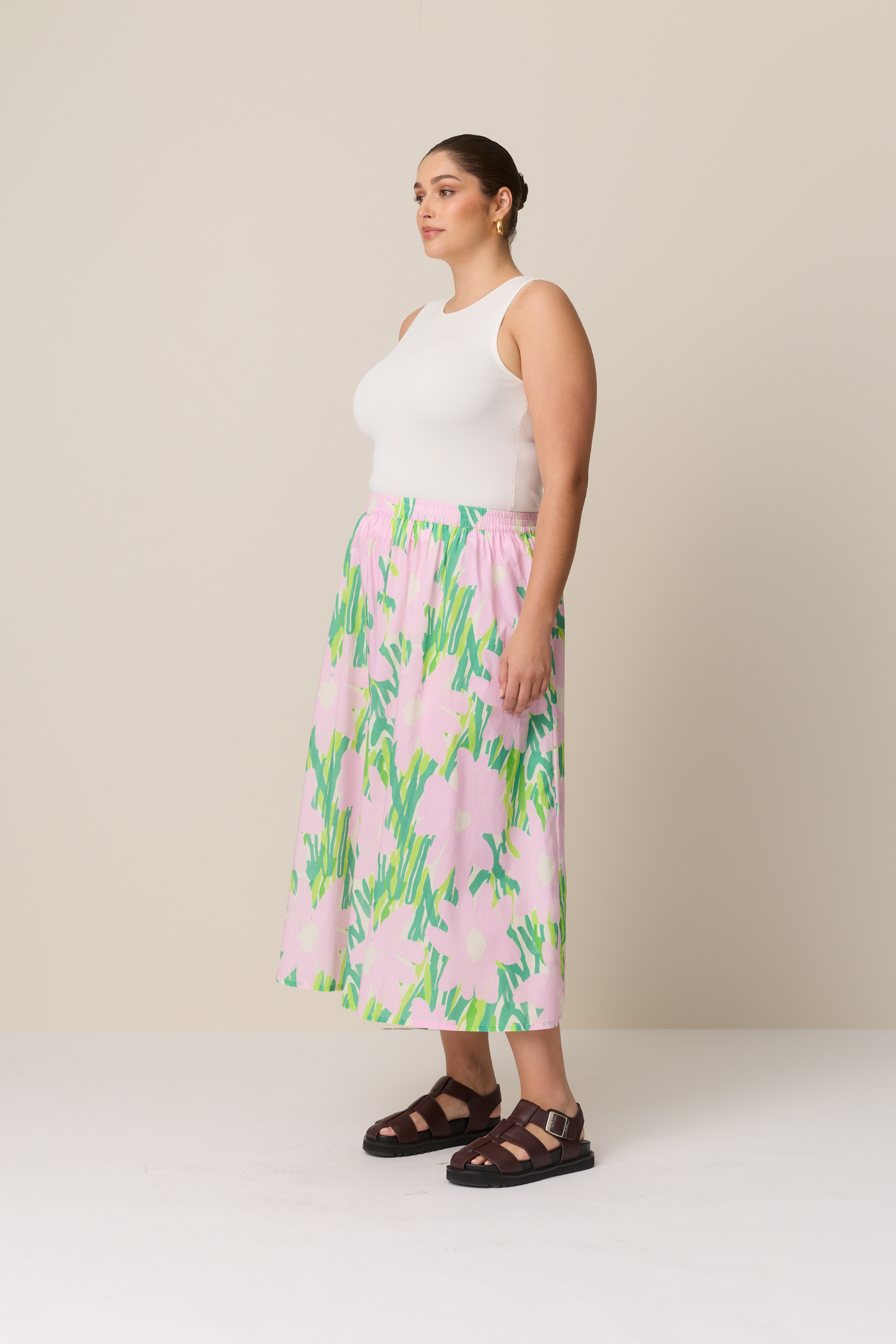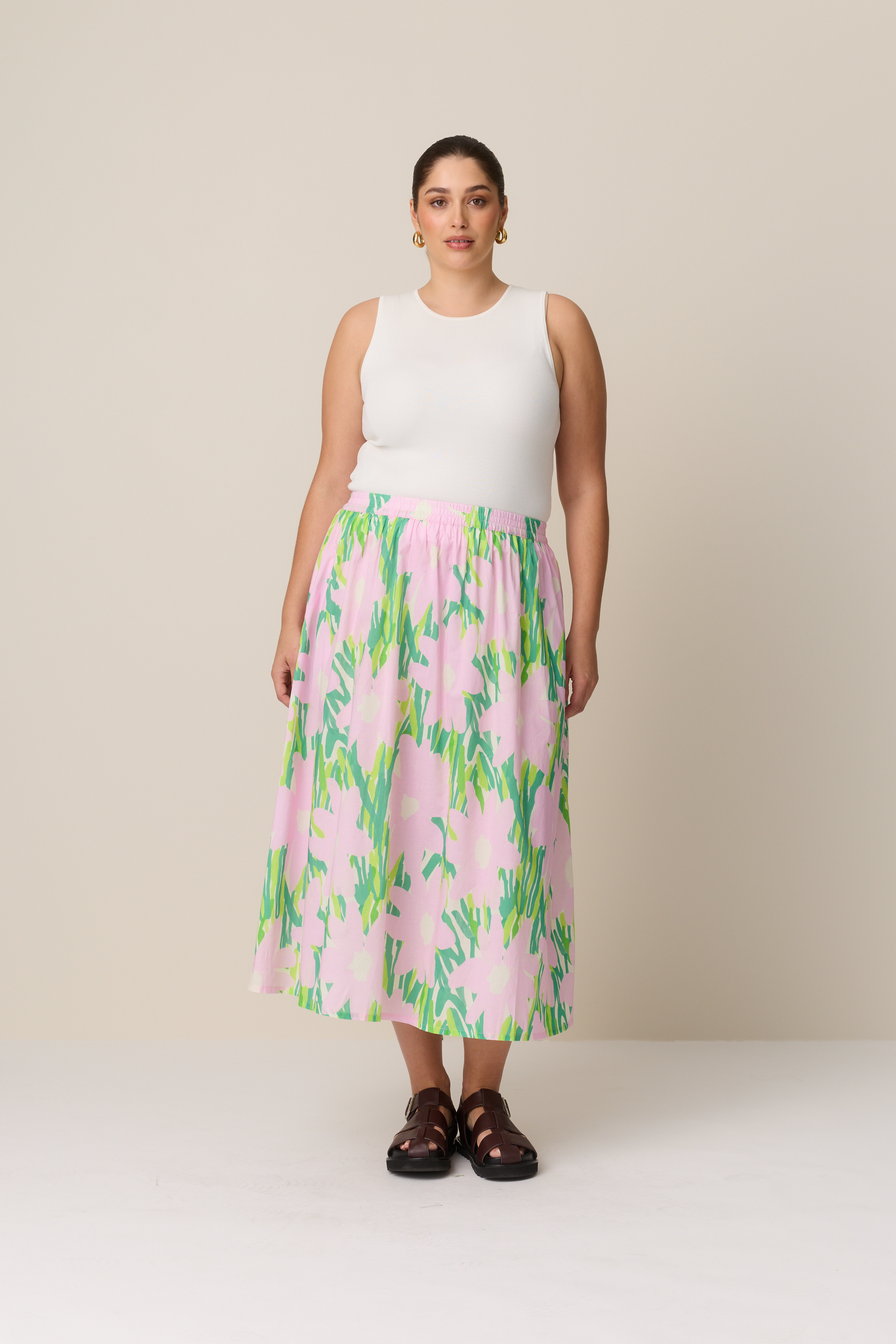 The Aster Gia Skirt is an a-line shaped, gathered, midi skirt.