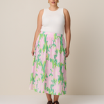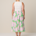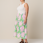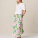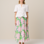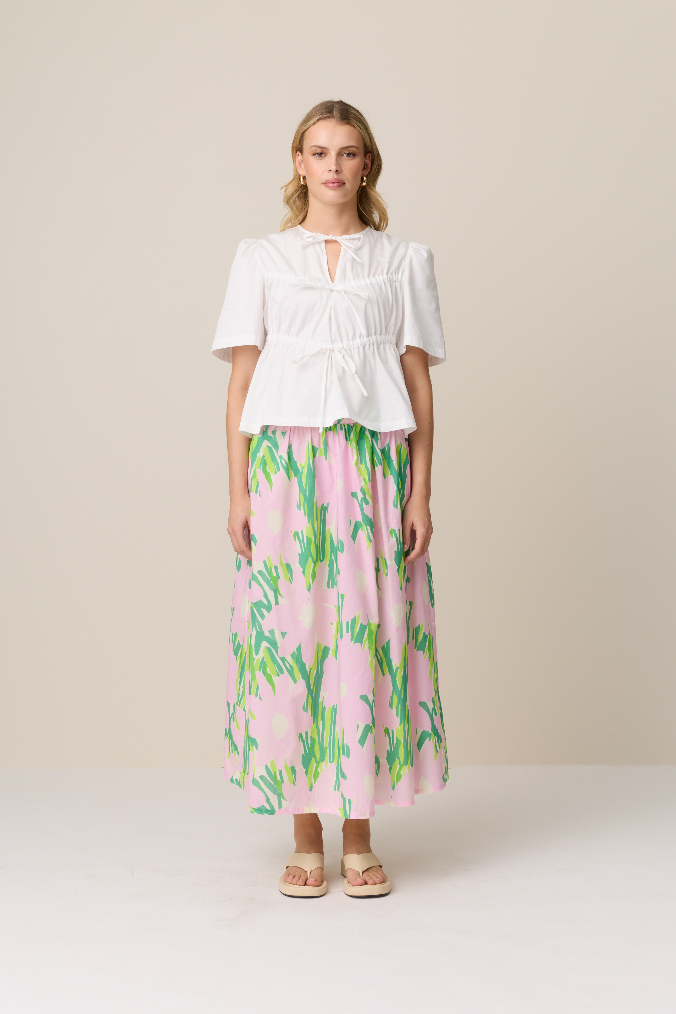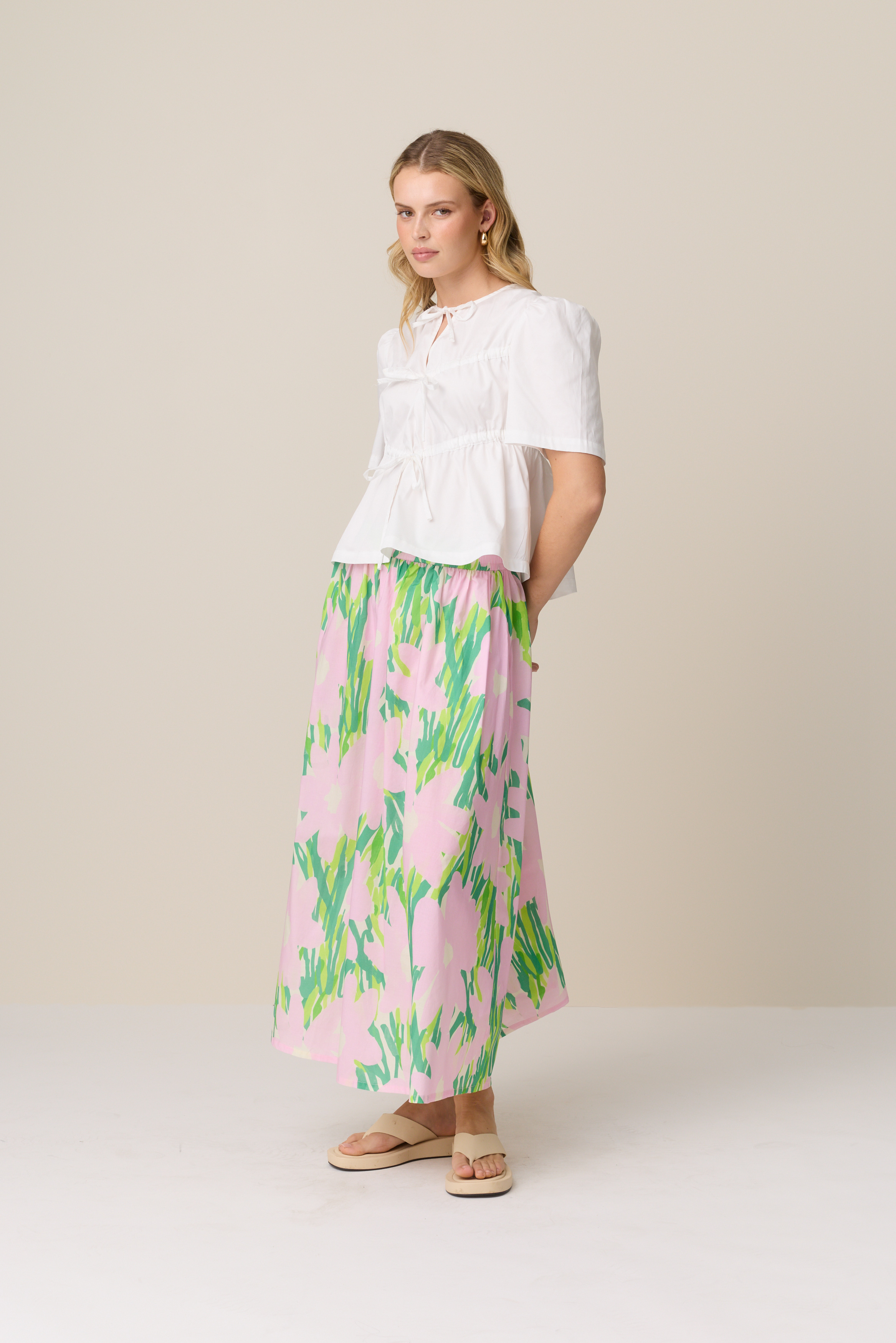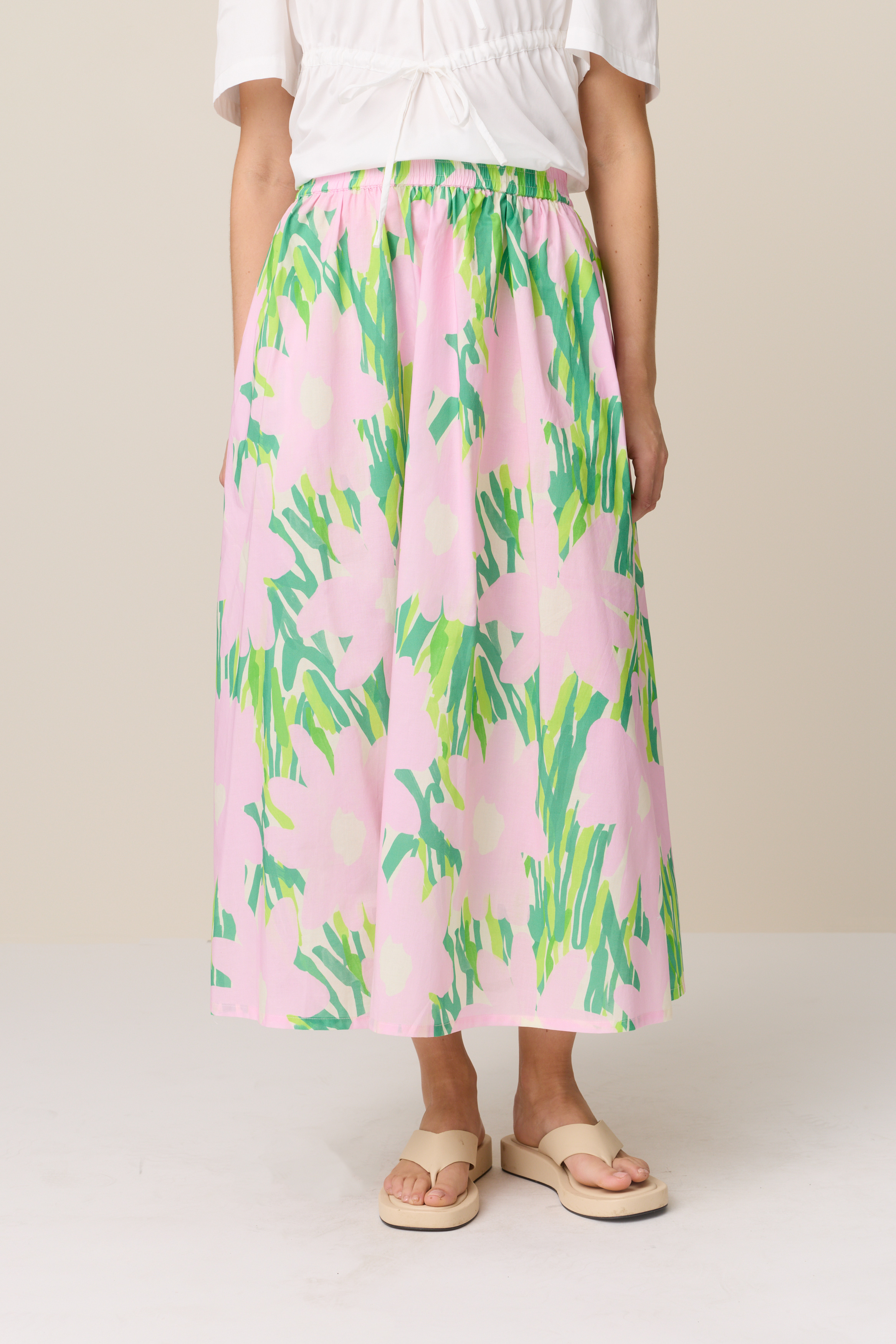 The Aster Gia Skirt is an a-line shaped, gathered, midi skirt.