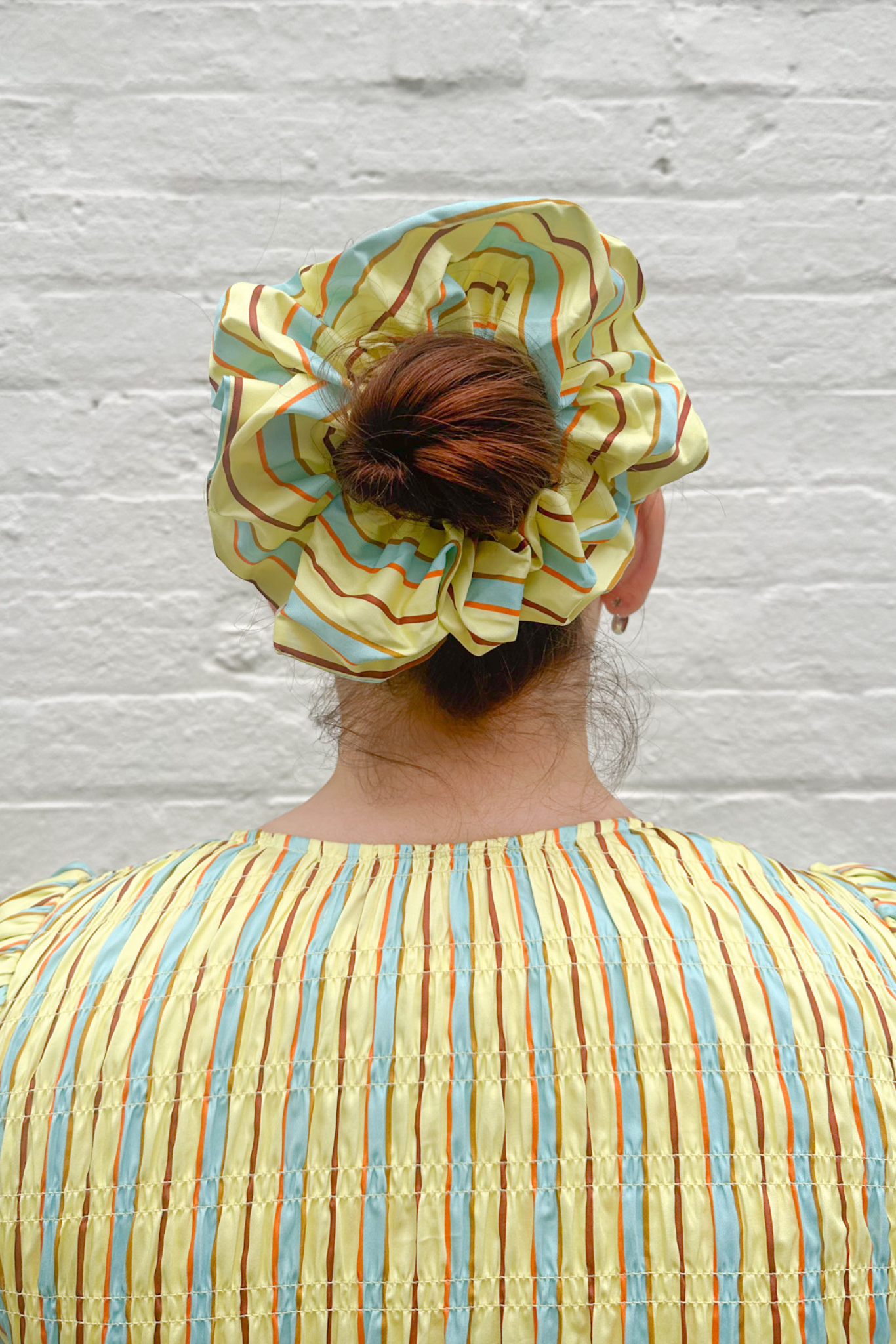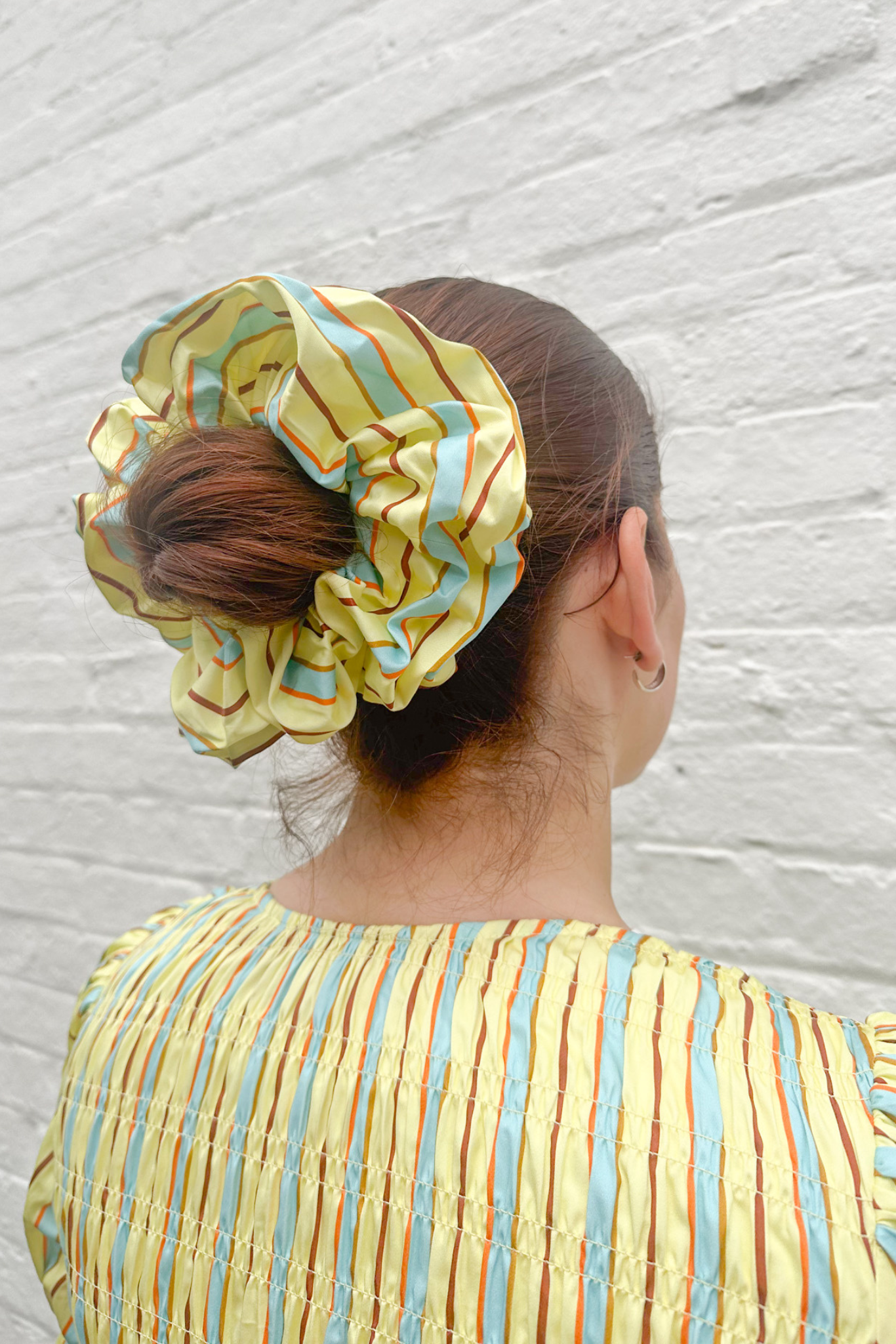 This scrunchie is made out of 100% Cotton printed in our Sunroom Stripe Print.