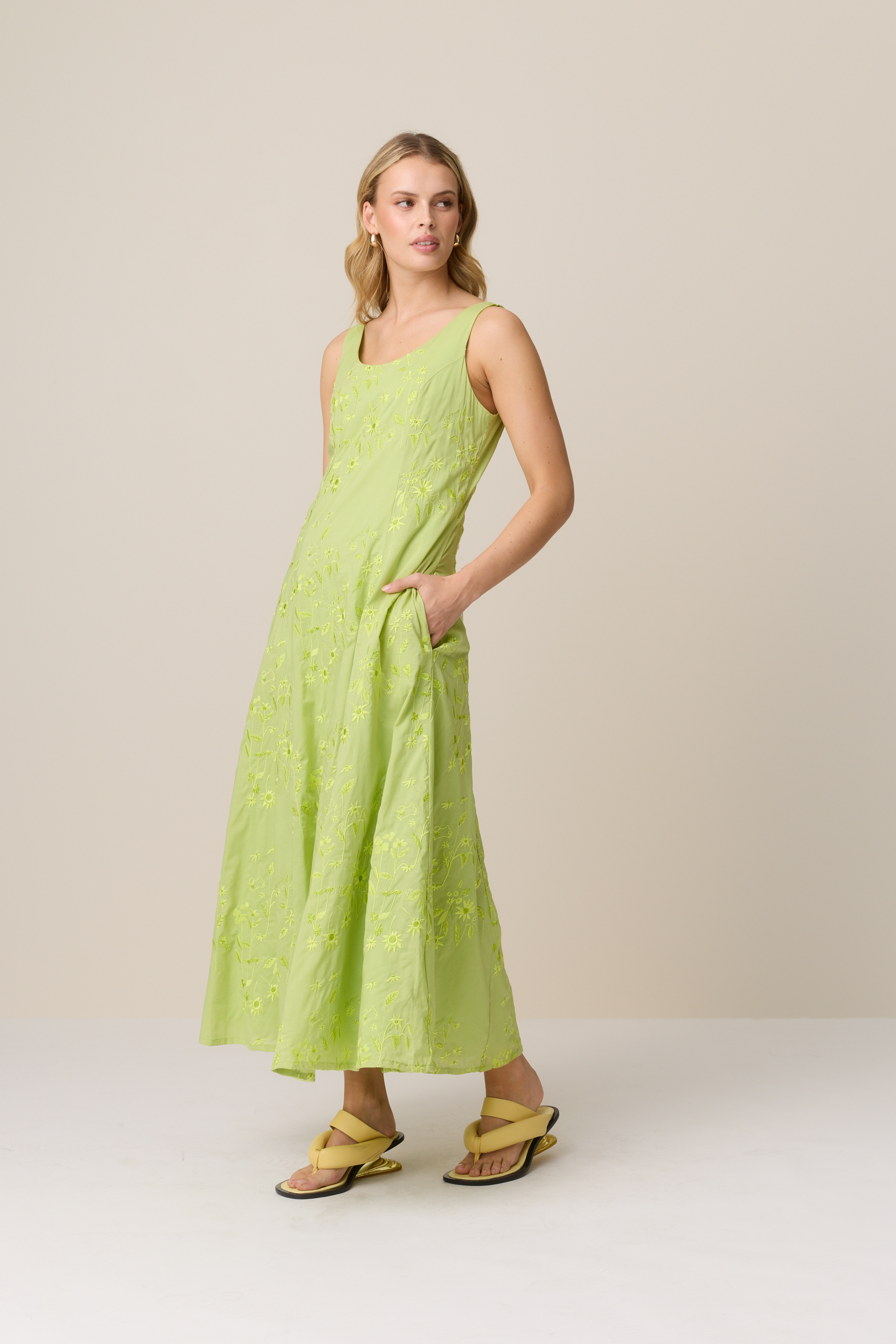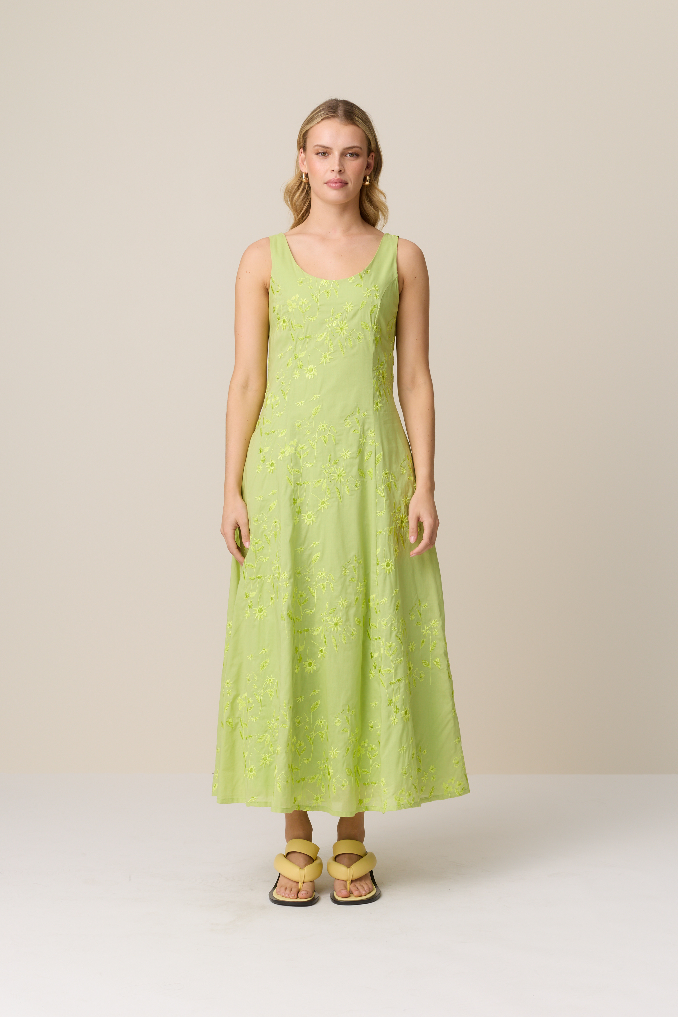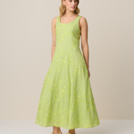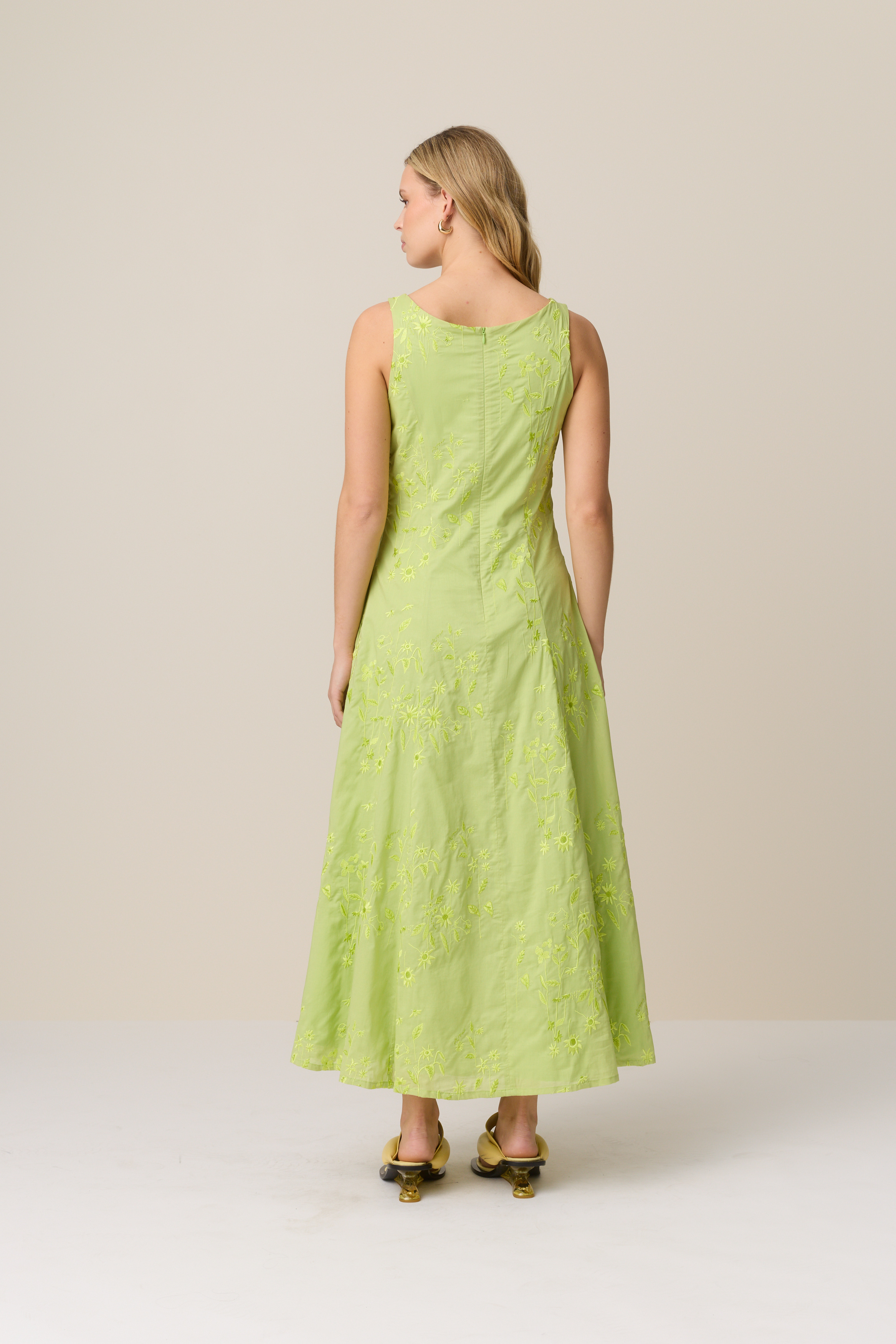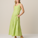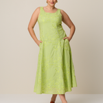 Our Trinket Dress is a semi-fitted princess seamed sun dress featuring our Matcha Garden embroidery.