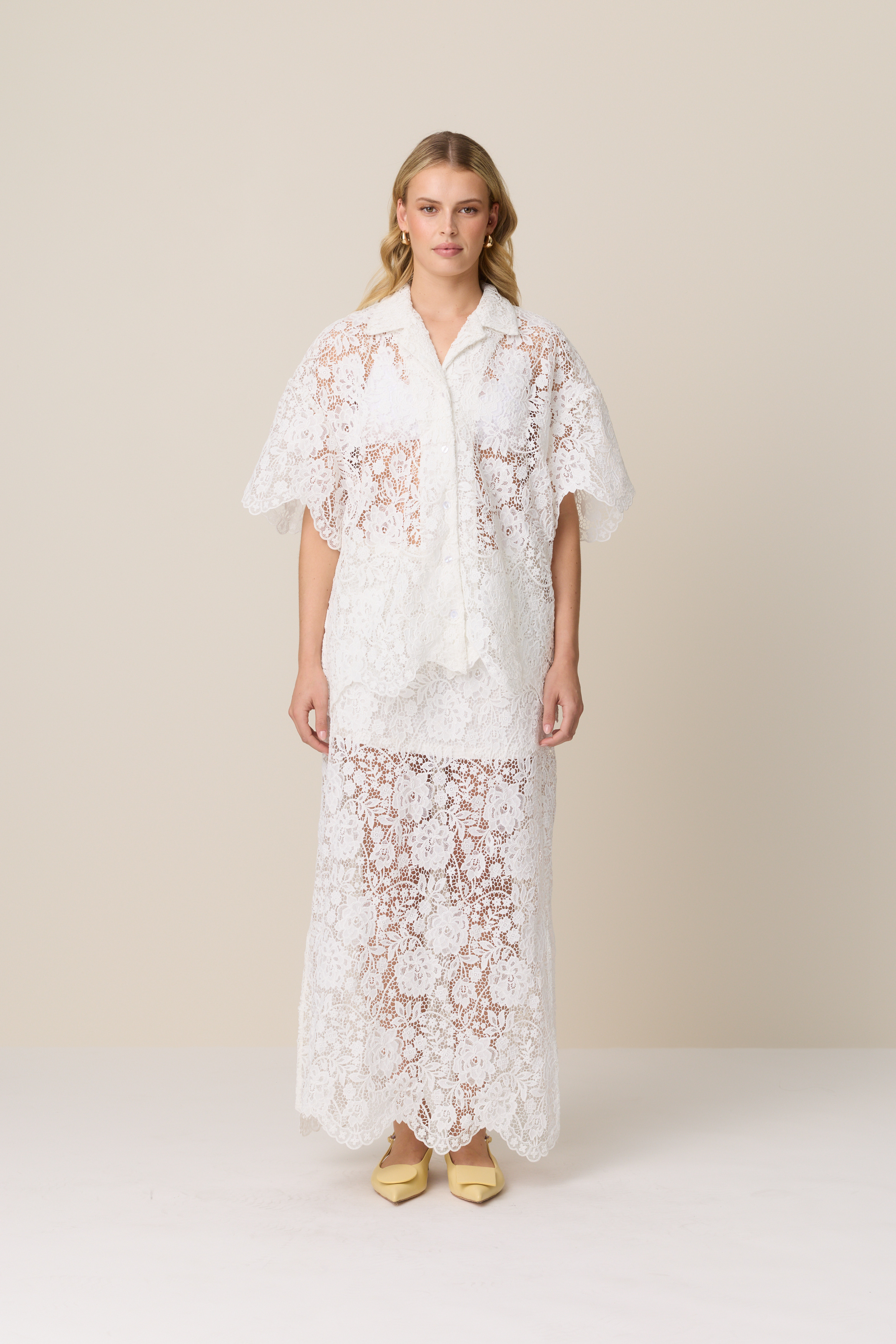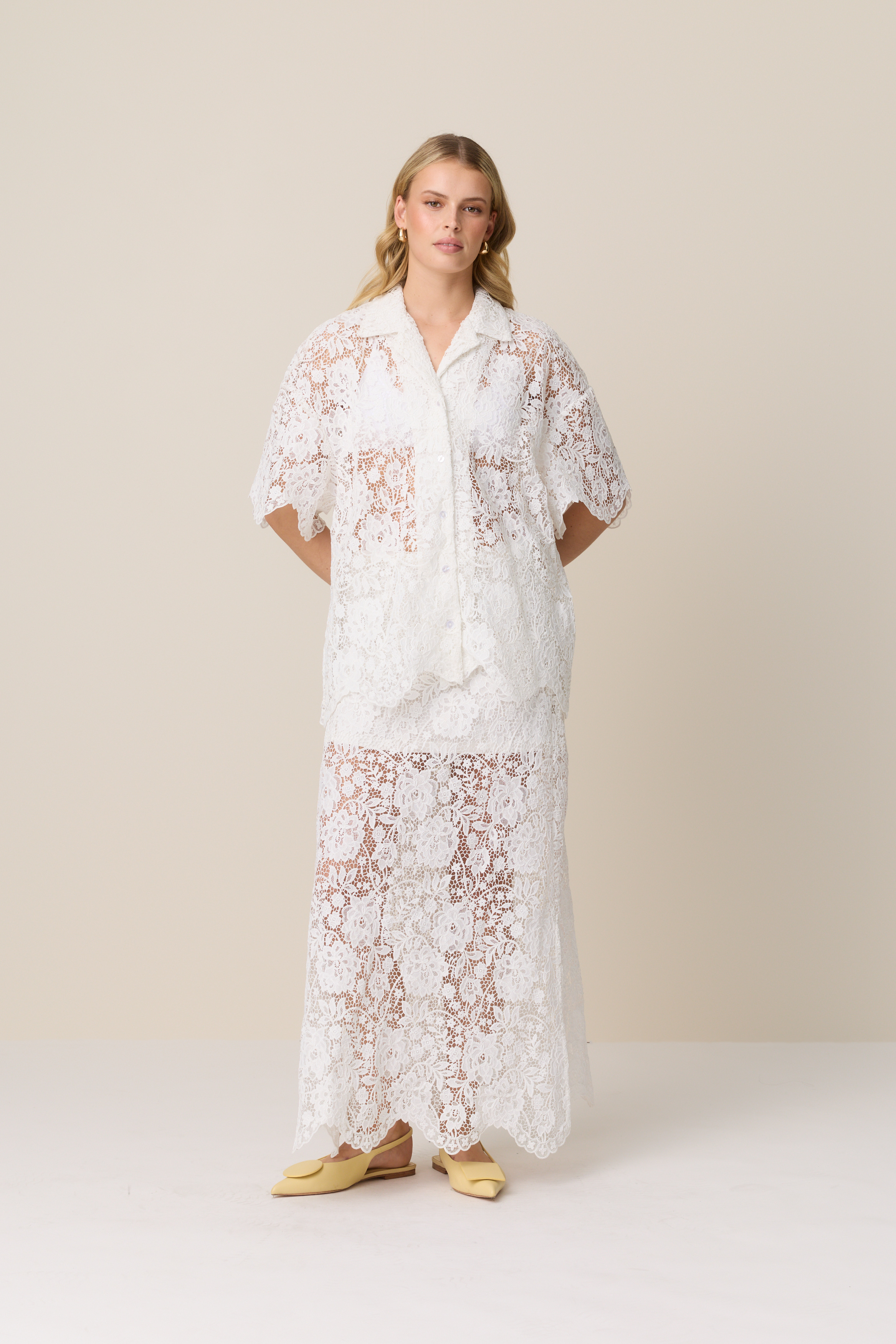 The Valletta Skirt is a maxi length, sheer lace skirt.